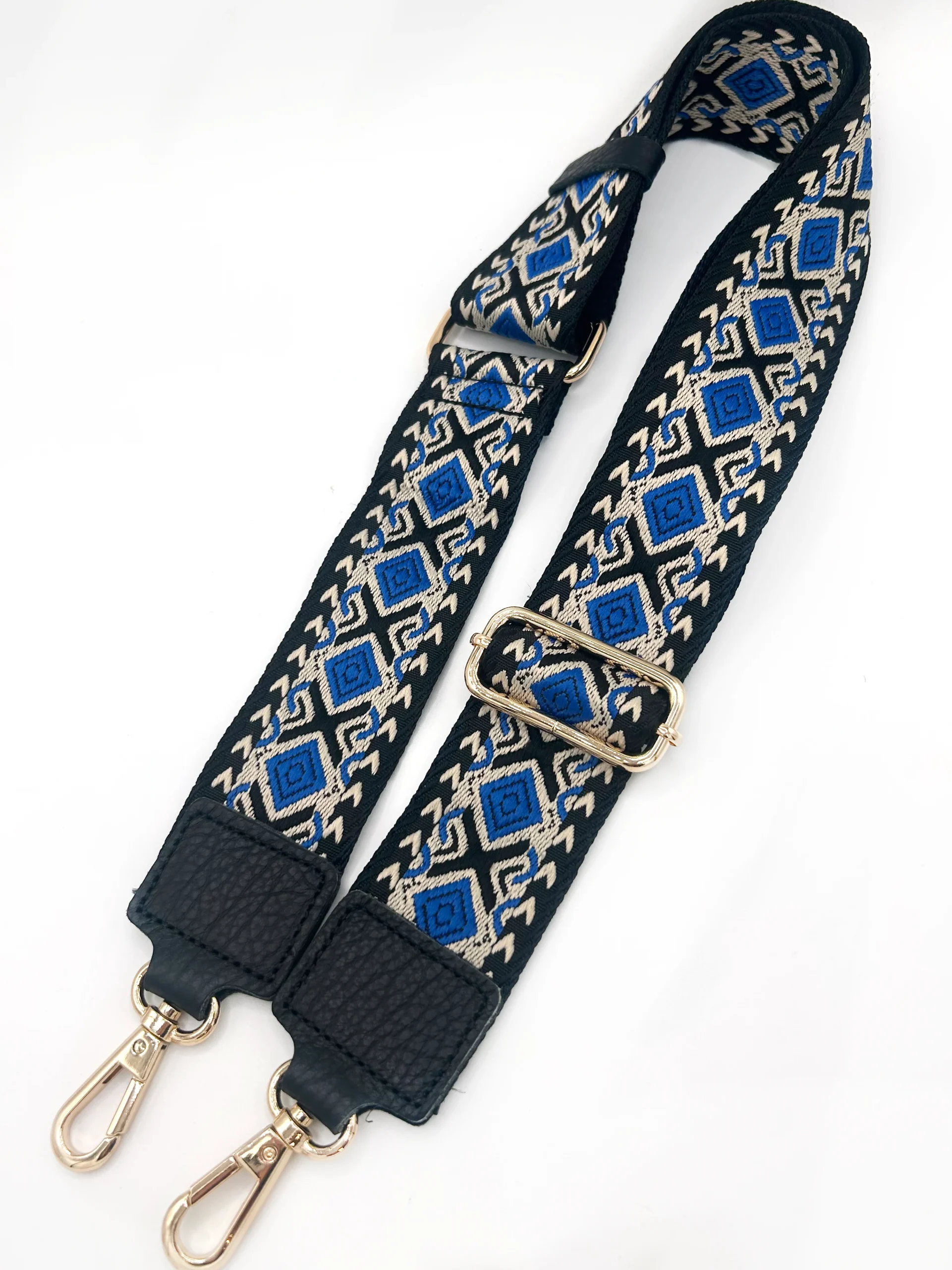 Composition : 50% coton 50% polyester – Couleur : Noir, beige, bleu roi – Largeur : 5cm – Longueur : réglable de 62 à 120cm – Crochets : dorés.