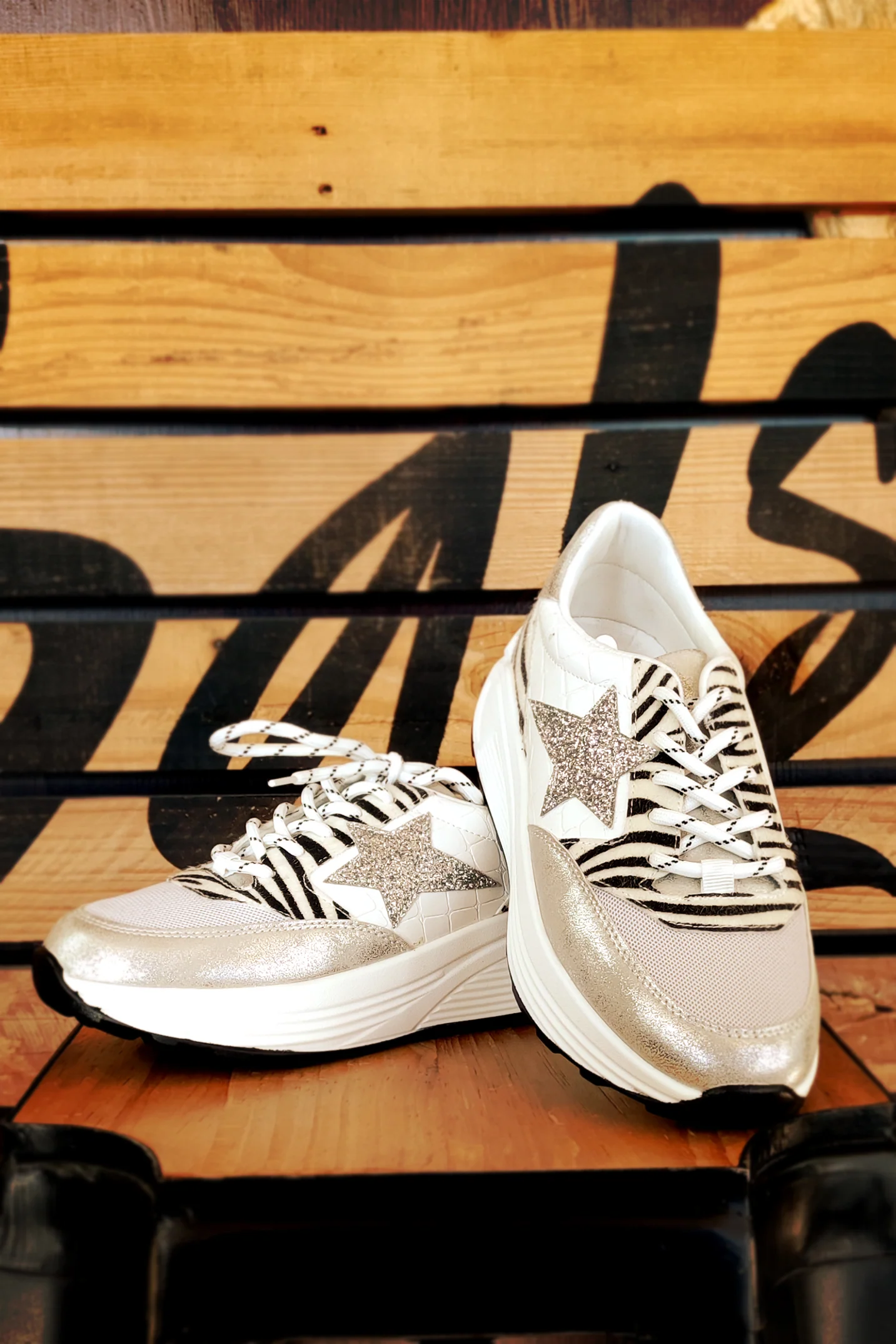 Découvrez les baskets Johannesburg et leur imprimé zèbre. On adore le mélange des textures, ses semelles compensées, ses lacets bicolors, son étoile brillantes et sa légèreté.