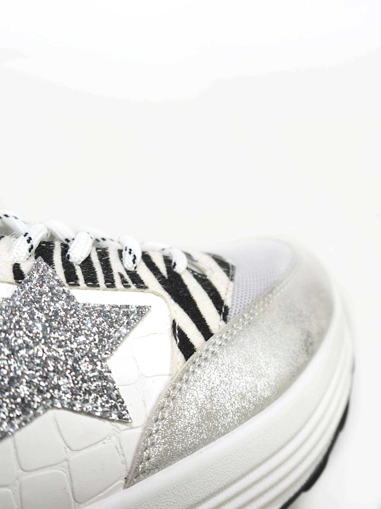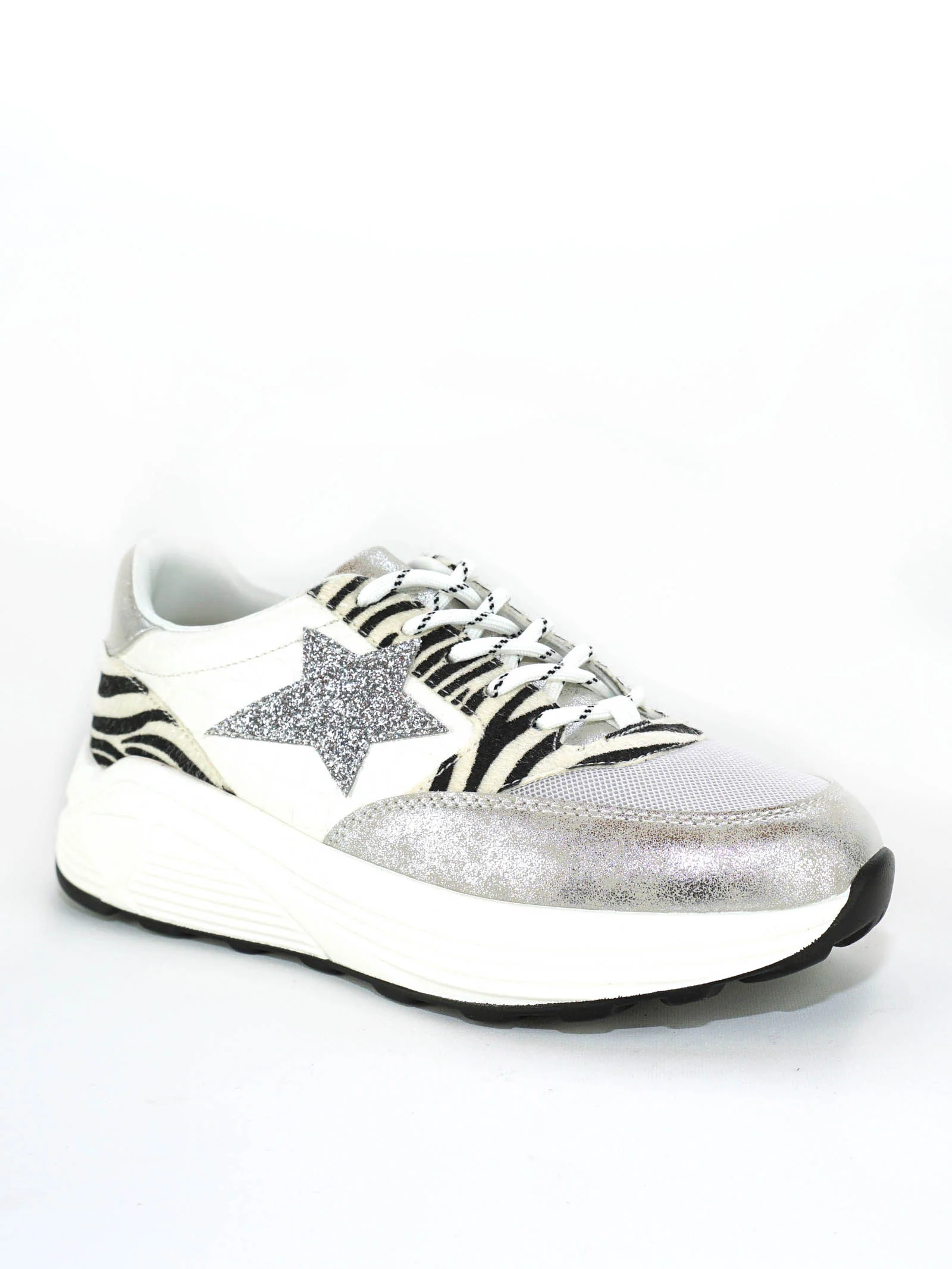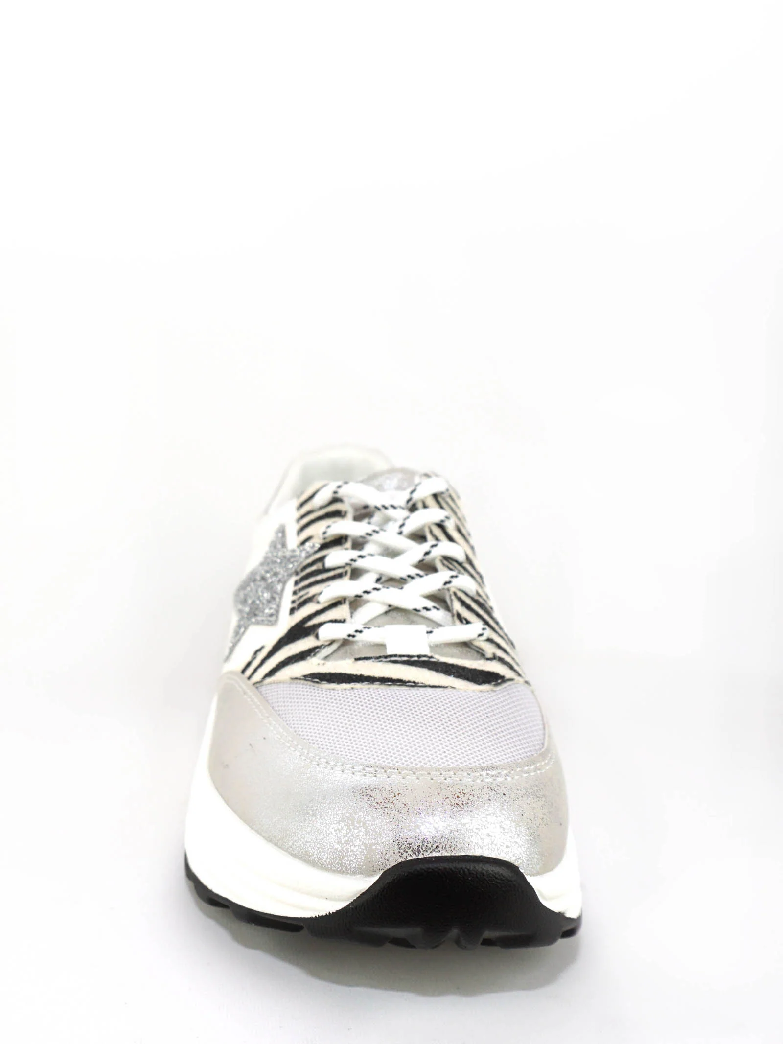 Composition : 100% synthétique – Imprimé : zèbre – Style : baskets – Couleurs : blanc, gris, noir, argenté – Fermeture : non – Lacets : oui – Tailles existantes : du 36 au 41
