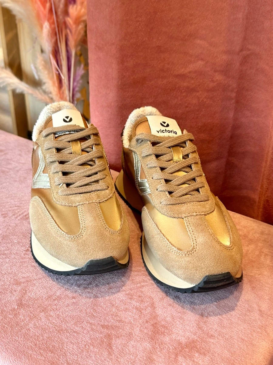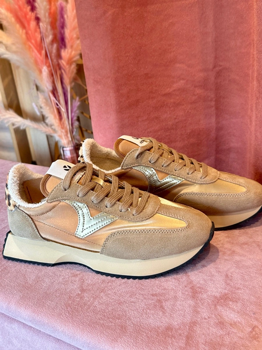 COSMOS, notre paire de baskets en cuir camel et nylon métal doré dégradé de chez Victoria. Les sneakers alliant style et confort pour un look décontracté et tendance au quotidien. Fermeture par lacets ton sur ton. Intérieur en éponge. La semelle ambrée et la bande crantée noire ajoutent une touche dynamique et décontractée. De plus, elles incluent une semelle intérieure amovible pour plus de confort et de polyvalence.