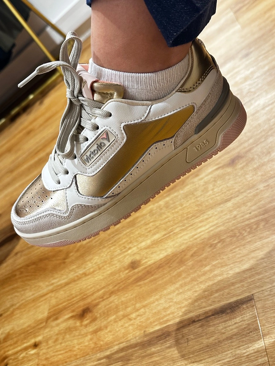 CLÉO, notre paire de baskets de chez Victoria dorée métallisée et touches rétro, qui est le combo parfait pour twister une tenue casual. Ultra confortables, super stylées.Elles comprennent également une semelle ergonomique qui s’adapte à la forme du pied et offre une sensation de confort.