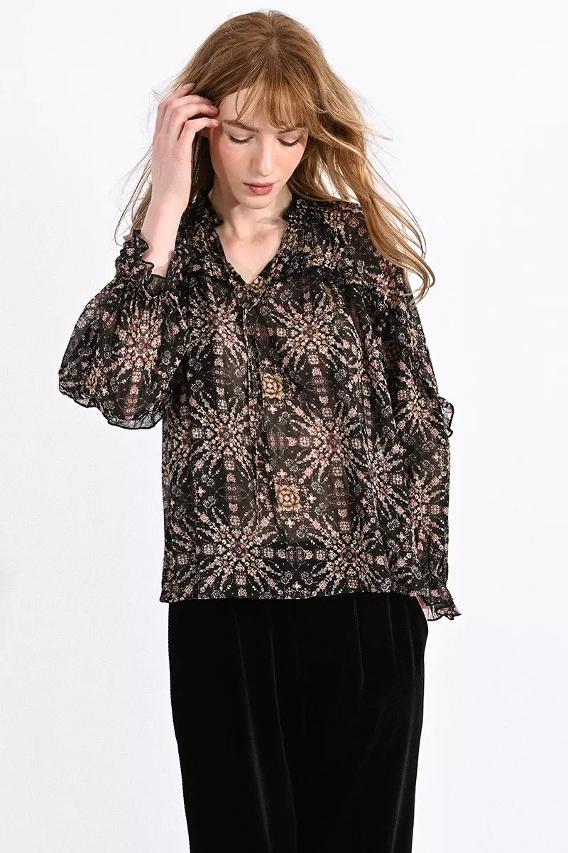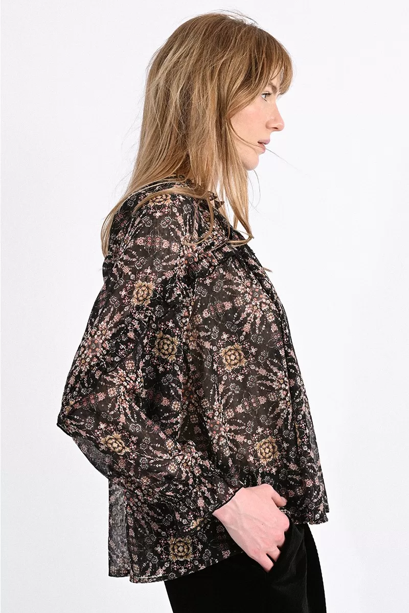 Découvrez la sophistication ultime avec la Blouse Hortense de la marque renommée Le Temps des Cerises. Cette pièce exquise incarne l’élégance intemporelle et la féminité moderne. Conçue pour la femme contemporaine. Cette blouse noire délicate est subtilement transparente, ajoutant une touche de mystère à votre tenue. Ses motifs délicats, parsemés de touches dorées et roses, captivent l’œil et ajoutent une dimension luxueuse à votre look.