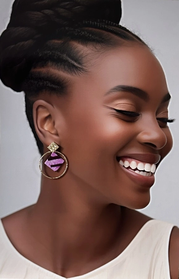 Boucles d’oreilles wax, version dorée, en acier inoxydable, entièrement fabriquées à la main et montées sur supports rigides de formes circulaires en wax 100% coton, accrochée à un anneau brillant