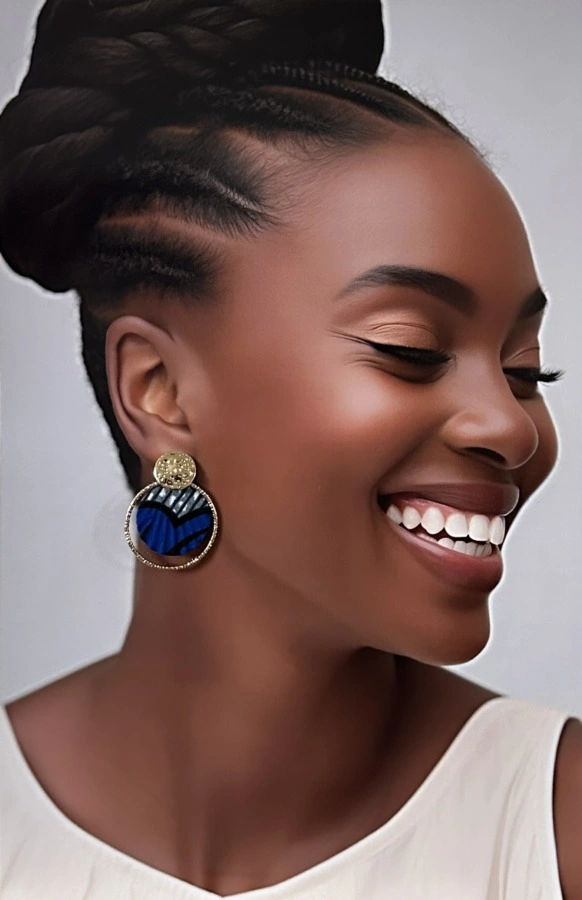 Boucles d’oreilles wax, version dorée, en acier inoxydable, entièrement fabriquées à la main et montées sur supports rigides de formes circulaires accrochés en wax 100% coton.