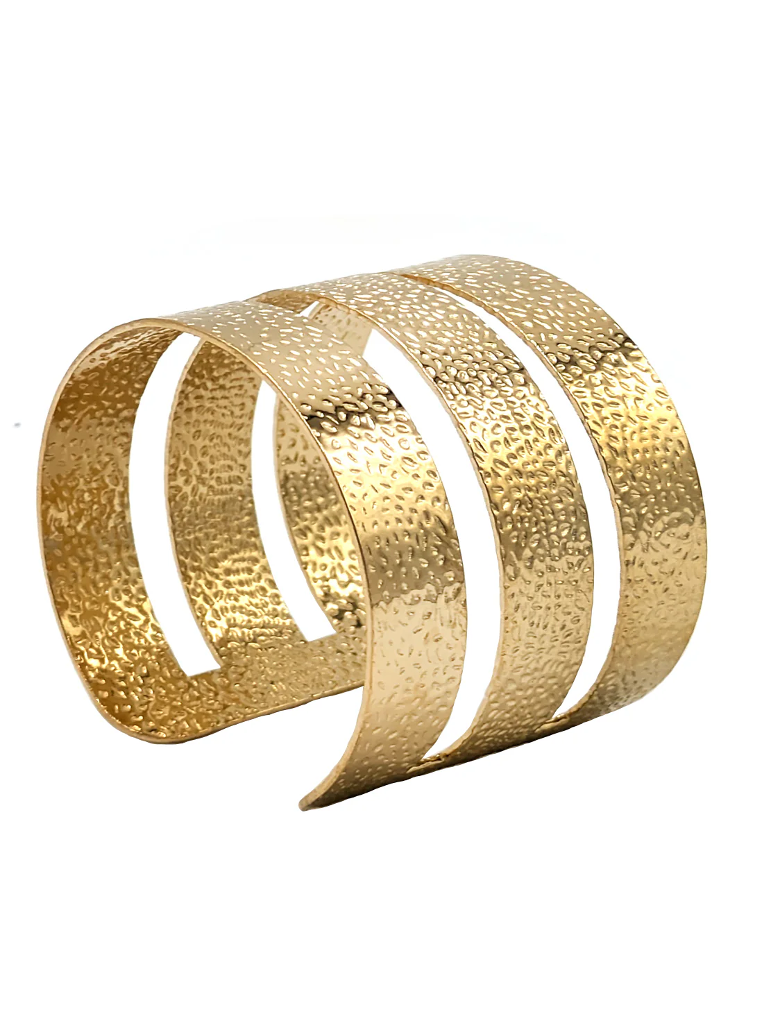 Manchette dorée Gypsy, le choix idéal pour mettre en valeur vos poignets ! Avec son acier inoxydable de haute qualité effet martelé, cette manchette offre à la fois un style unique et une qualité exceptionnelle.