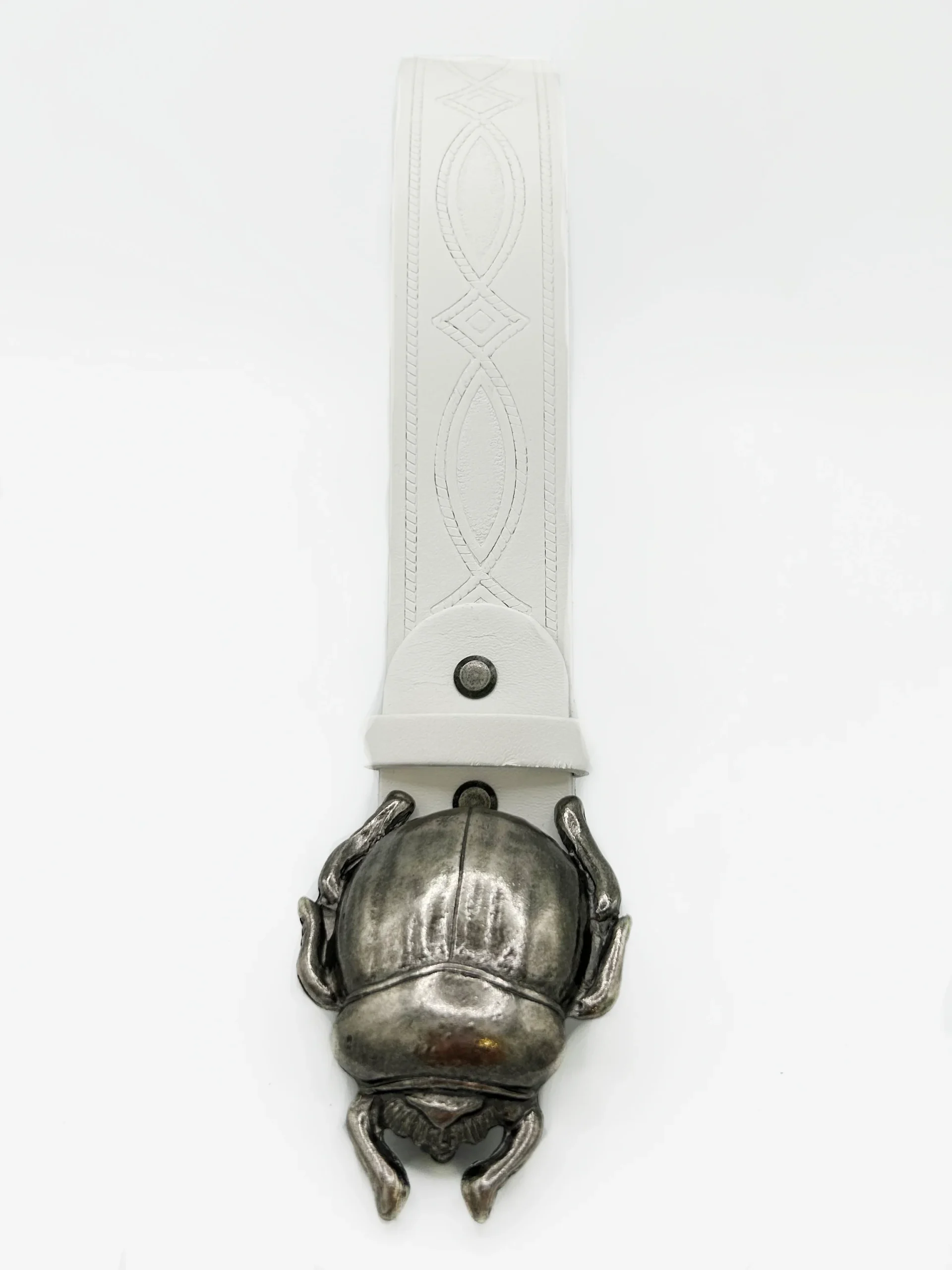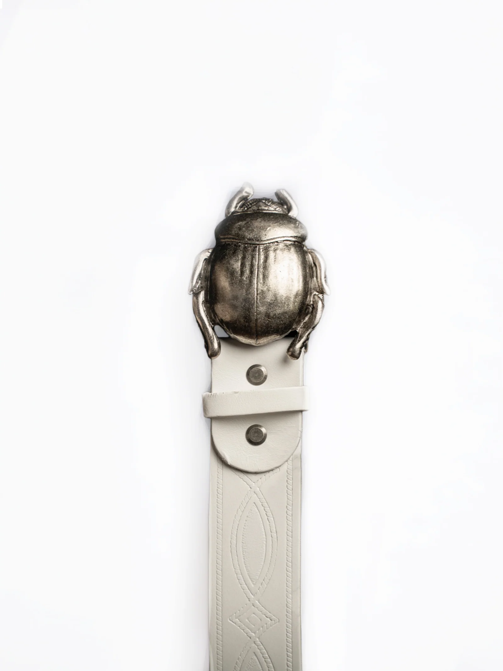 Relevez le défi avec la ceinture en cuir blanc Tirana. Sa boucle scarabée ajoute une note d’élégance à votre look et la rend parfaite pour les aventurières modernes. Choisissez-la et démontrez votre audace !