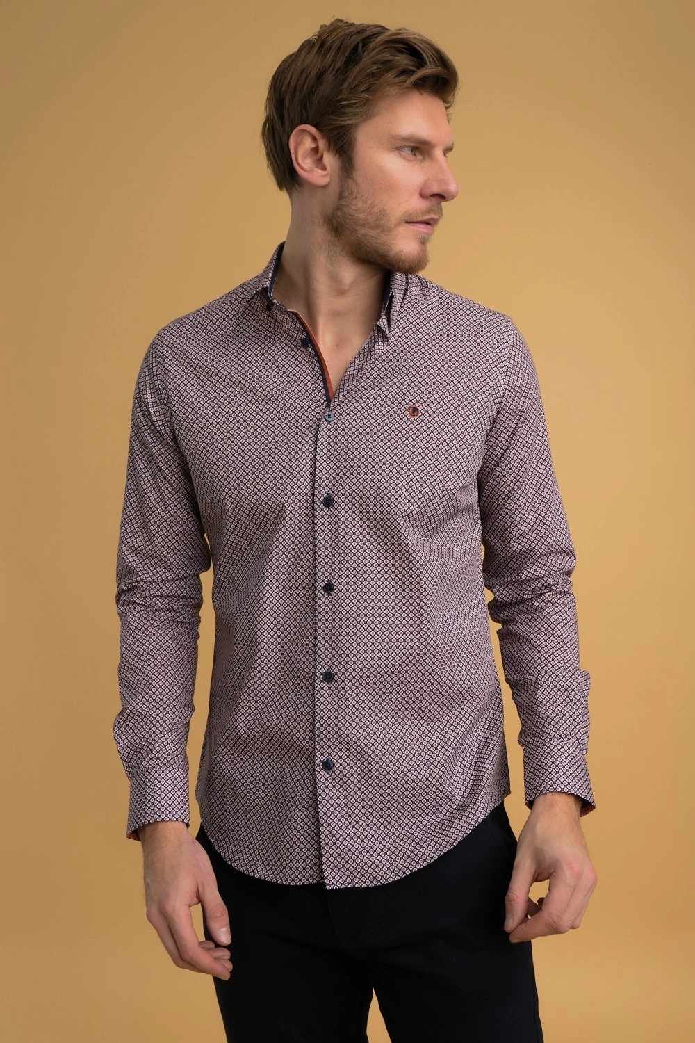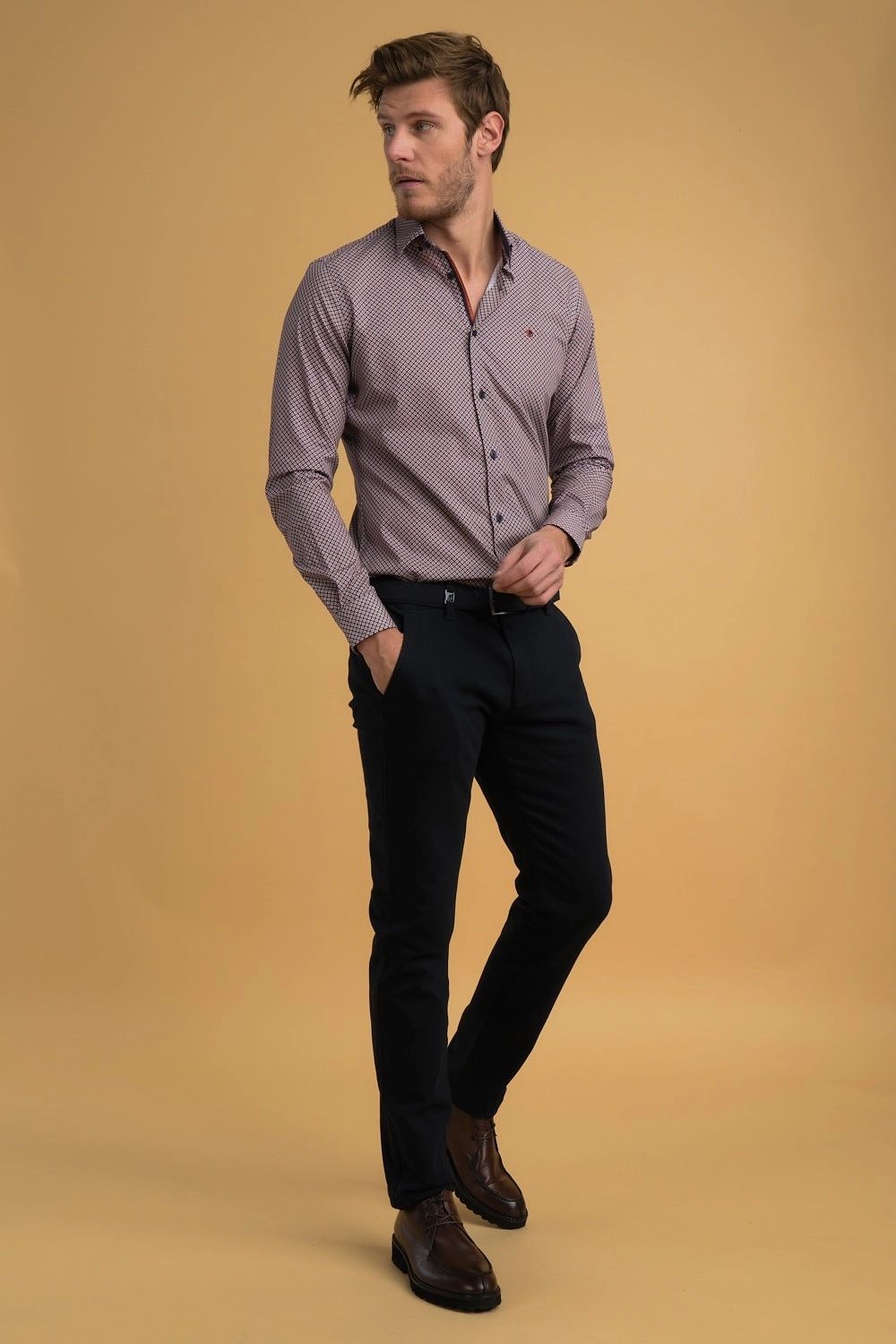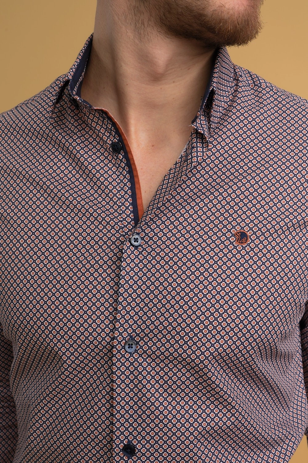 La combinaison harmonieuse de nuances marines et brique confère à cette chemise une polyvalence remarquable. Parfaite pour une variété d’occasions, qu’il s’agisse d’une journée au bureau ou d’une soirée décontractée entre amis. Son design sophistiqué est complété par une coupe impeccable qui met en valeur la silhouette masculine avec élégance et confort.