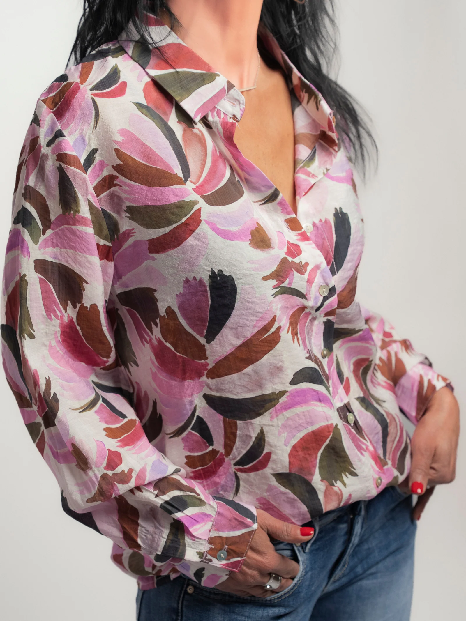 La chemise Sarah séduit par ses motifs délicats dans des tons violet et rose poudré, pour un style féminin, raffiné et tout en subtilité. Sa coupe fluide et légère en fait une pièce idéale à porter en toutes saisons.