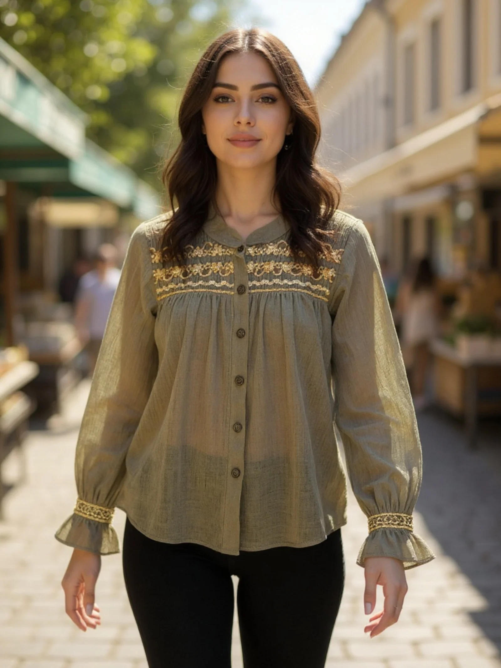Cette matière légère et respirante offre un confort incomparable pour vos journées. Avec son col Mao distinctif et ses boutons élégants, ce vêtement allie style intemporel et praticité. Les touches de jaune apportent une luminosité subtile qui ravive l’ensemble kaki, tandis que les poignets élastiqués assurent un ajustement parfait. Une pièce polyvalente qui devient rapidement un basique indispensable de votre garde-robe. kaki avec col Mao et fermeture boutonnée. broderie lumineux en jaune qui illuminent subtilement le design épuré. Poignets ajustables avec élastique pour un confort optimal et une silhouette affinée
