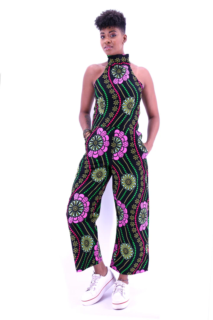 Combinaison pantalon à col montant sans manches avec fermeture dans le dos. À la fois décontracté et classe. En tissu wax.