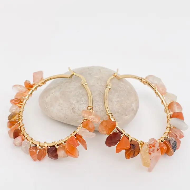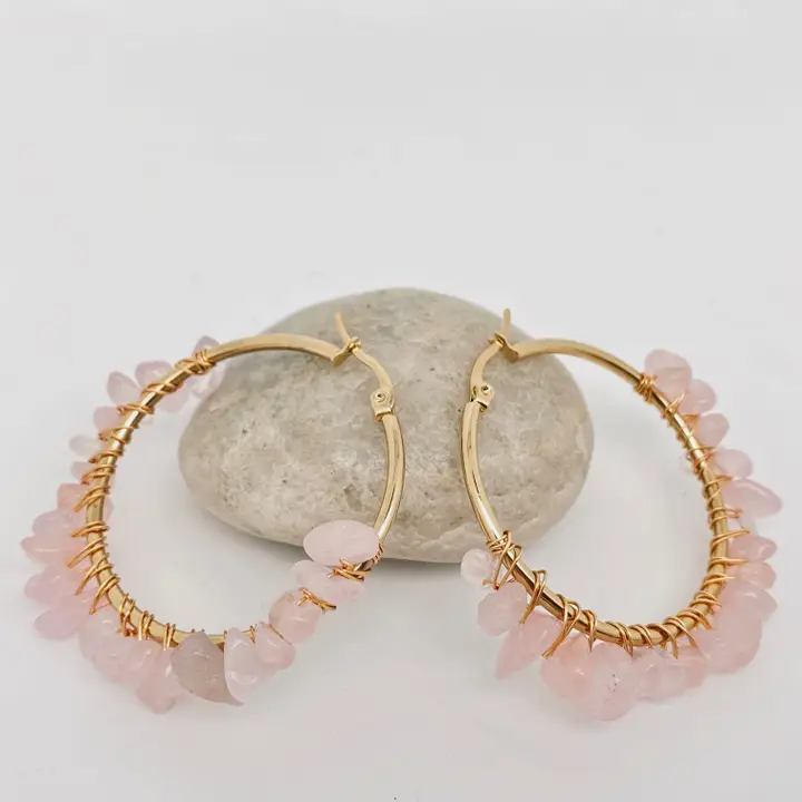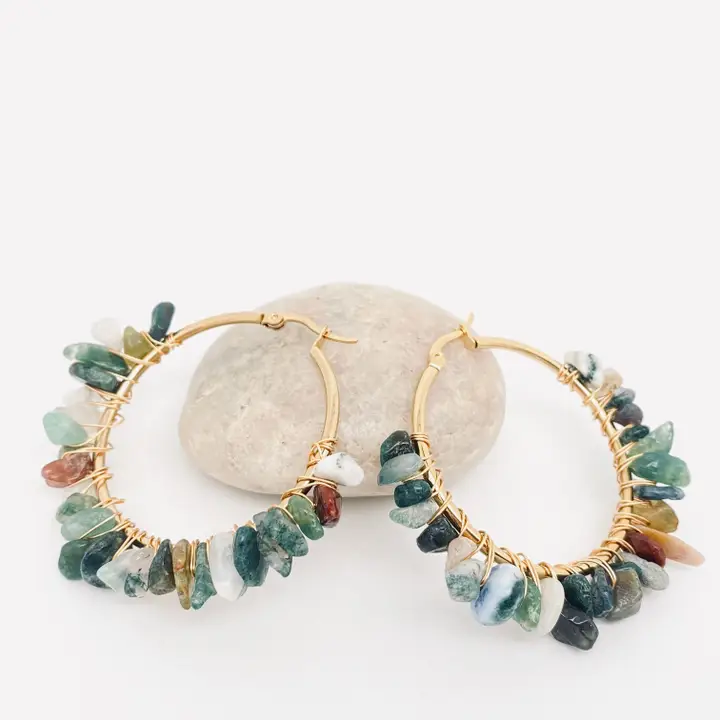 Nous sélectionnons chaque pierre avec soin pour sa beauté naturelle et sa qualité. Ajoutant une touche unique à chaque paire de créoles. L’acier inoxydable doré offre un éclat durable, assurant que ces bijoux restent aussi éblouissants que le jour où vous les avez reçus.