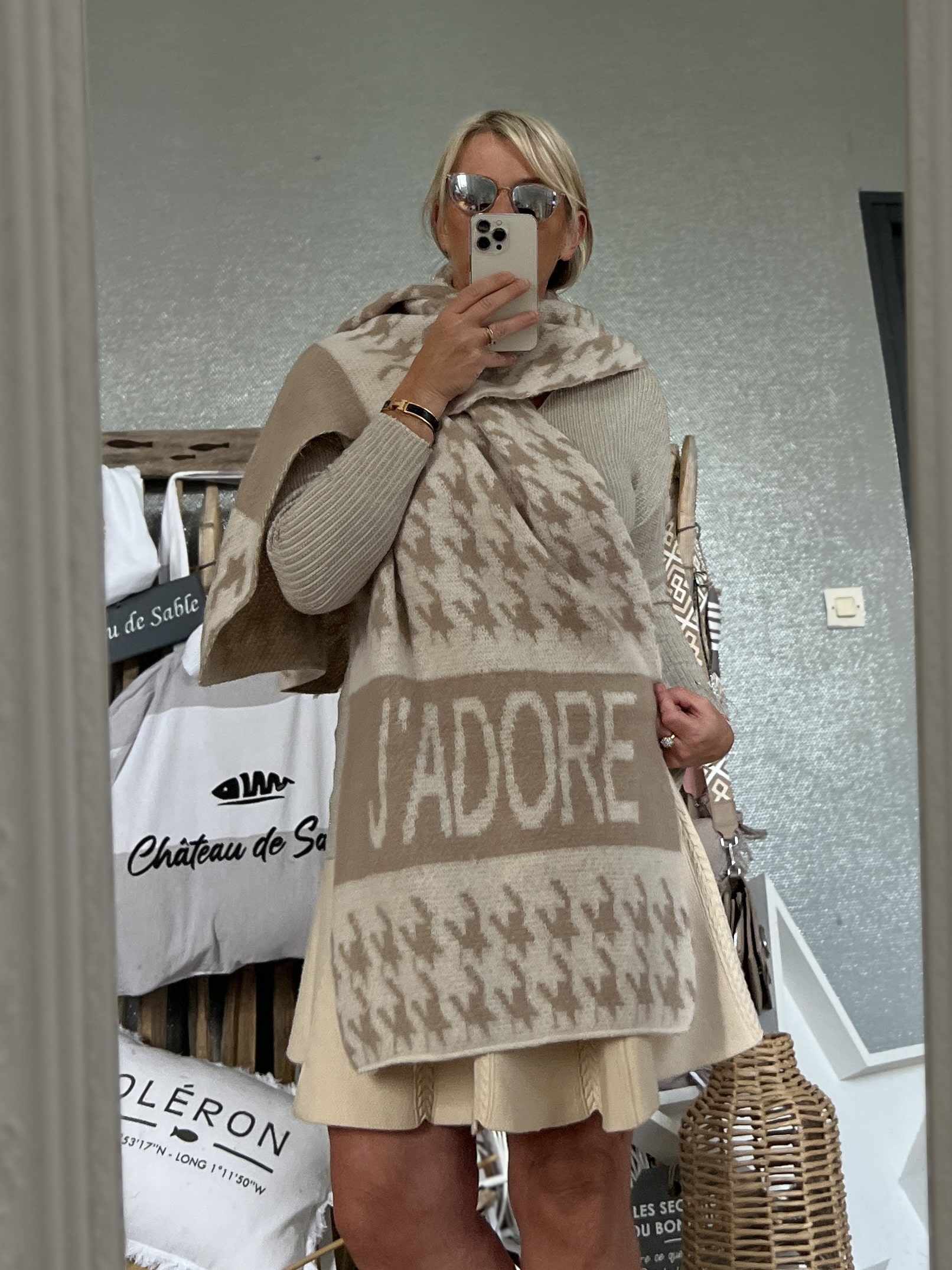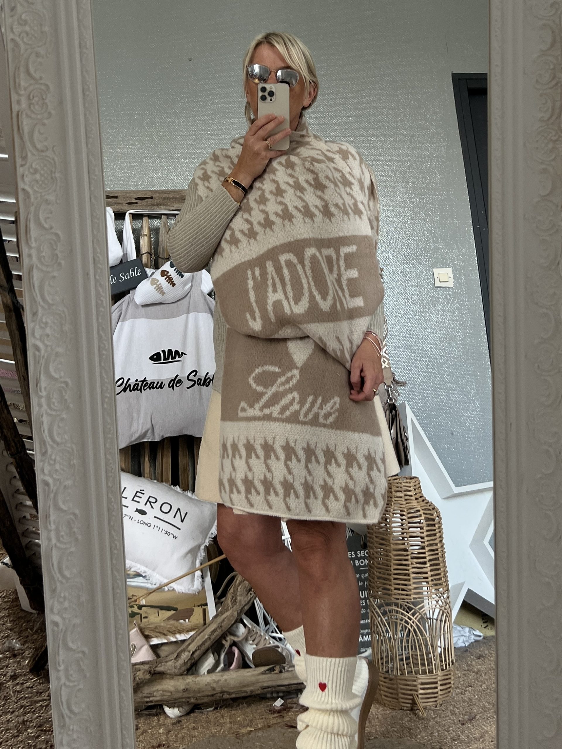 Cette écharpe longue et épaisse présente un motif pied de poule orné des inscriptions « J’adore » et « Love ». Fabriquée à partir de 100 % de viscose, elle assure un drapé somptueux. Mesurant 180 cm x 40 cm, cette écharpe offre une couverture généreuse malgré sa largeur plus étroite. Le motif pied de poule associé aux messages apporte une touche de charme et d’expression à cet accessoire.