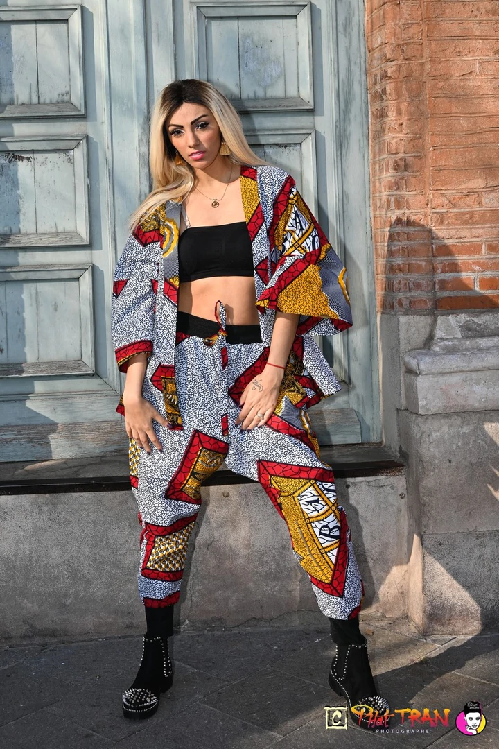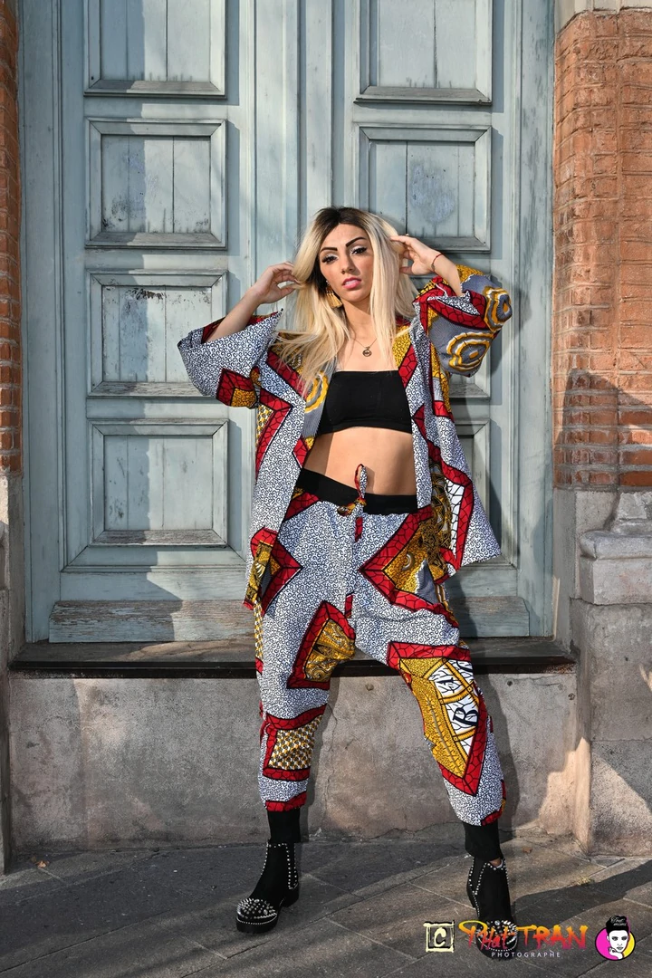 Ensemble très original en wax composé d’une veste kimono et d’un pantalon sarouel ajustable à la taille Taille: L