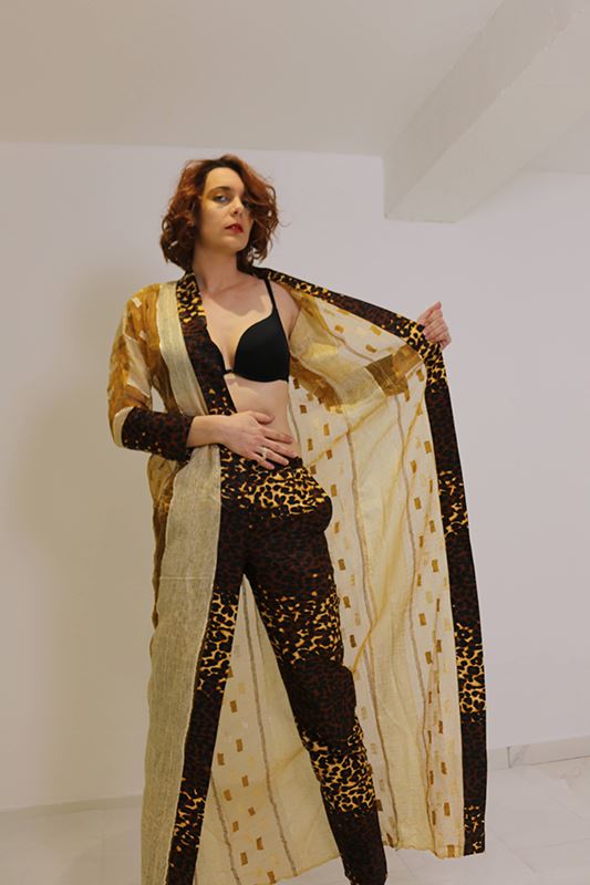 Ensemble en wax composé d’un pantalon droit en wax (imprimé léopard), et d’une veste longue légère et transparente ouverte à col bordé par le tissu du pantalon, manches longues. Cet ensemble chic et sexy peut être porté lors d’une soirée chic et glamour tout en restant élégante.