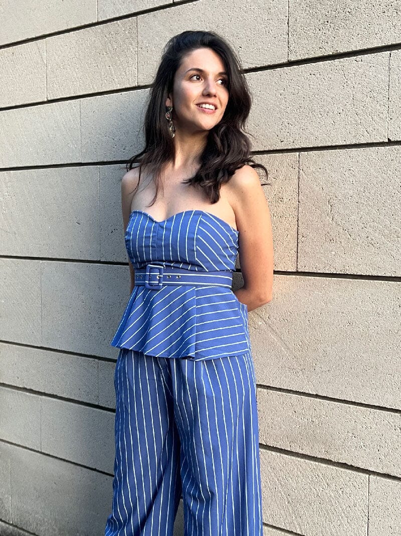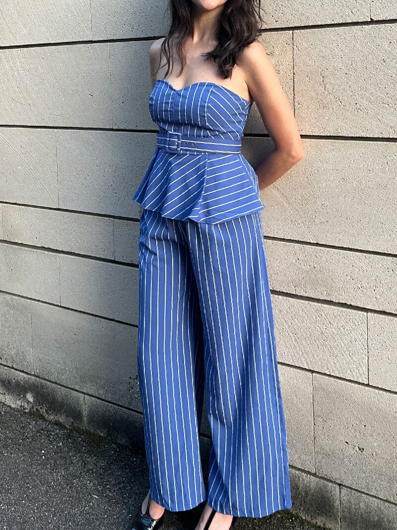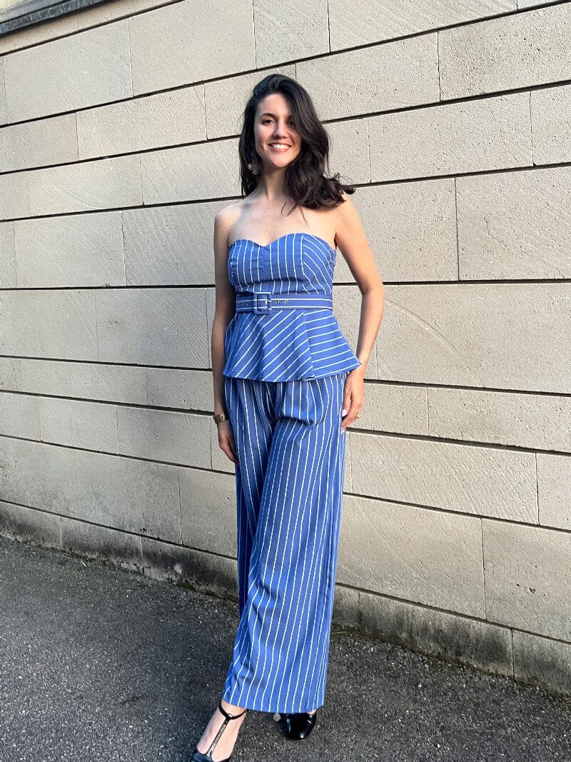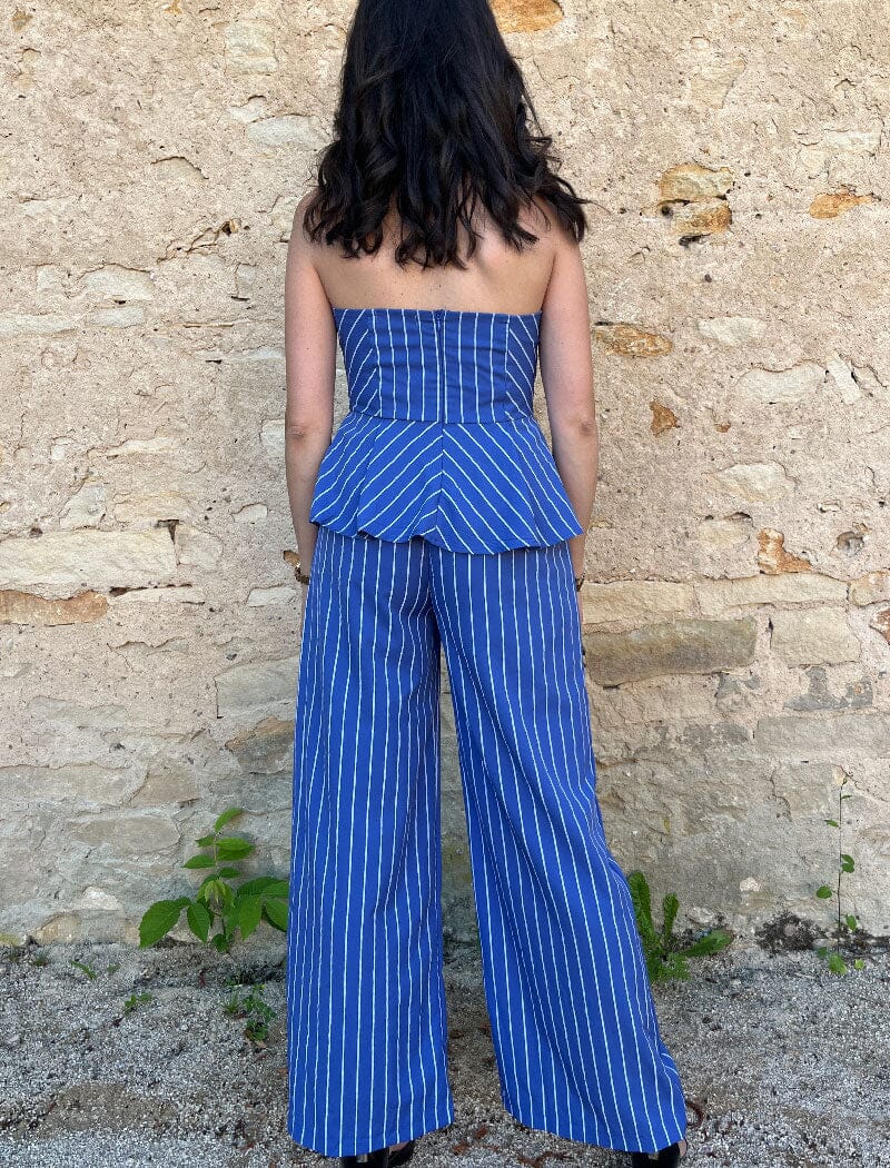 Élégant Ensemble Pantalon bleu rayé blanc, parfait pour une soirée chic ou en tant qu’invitée à un mariage.