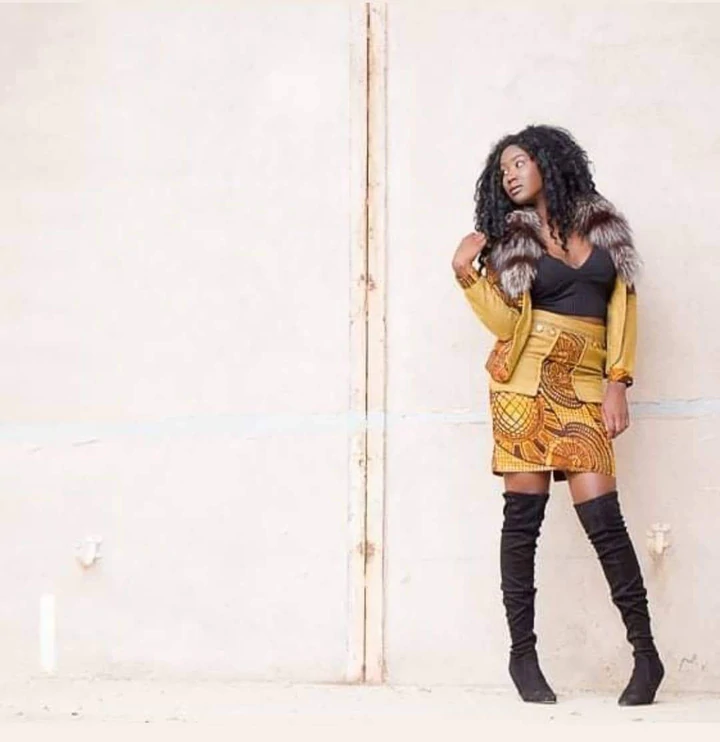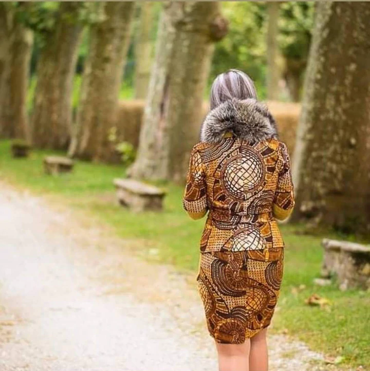 Ensemble tailleur veste et jupe très originale en wax et tweed. Un savant mélange de matières qui match ! Et pour la touche élégante, la fourrure détachable à porter avec ou sans autour du col.