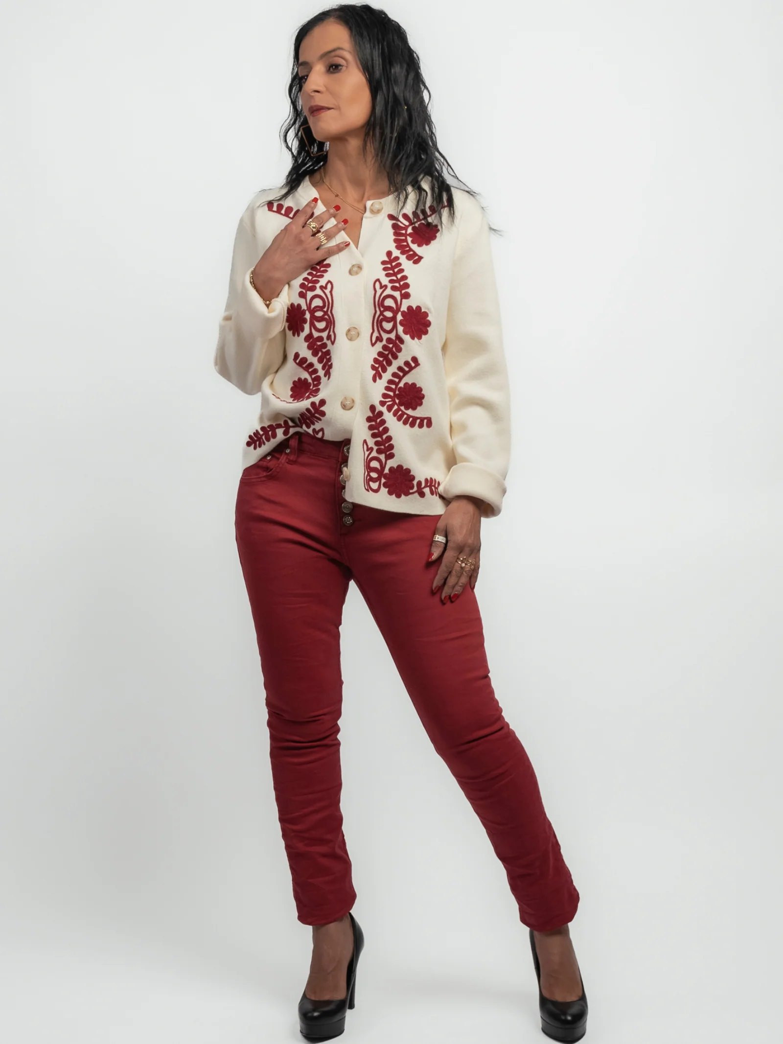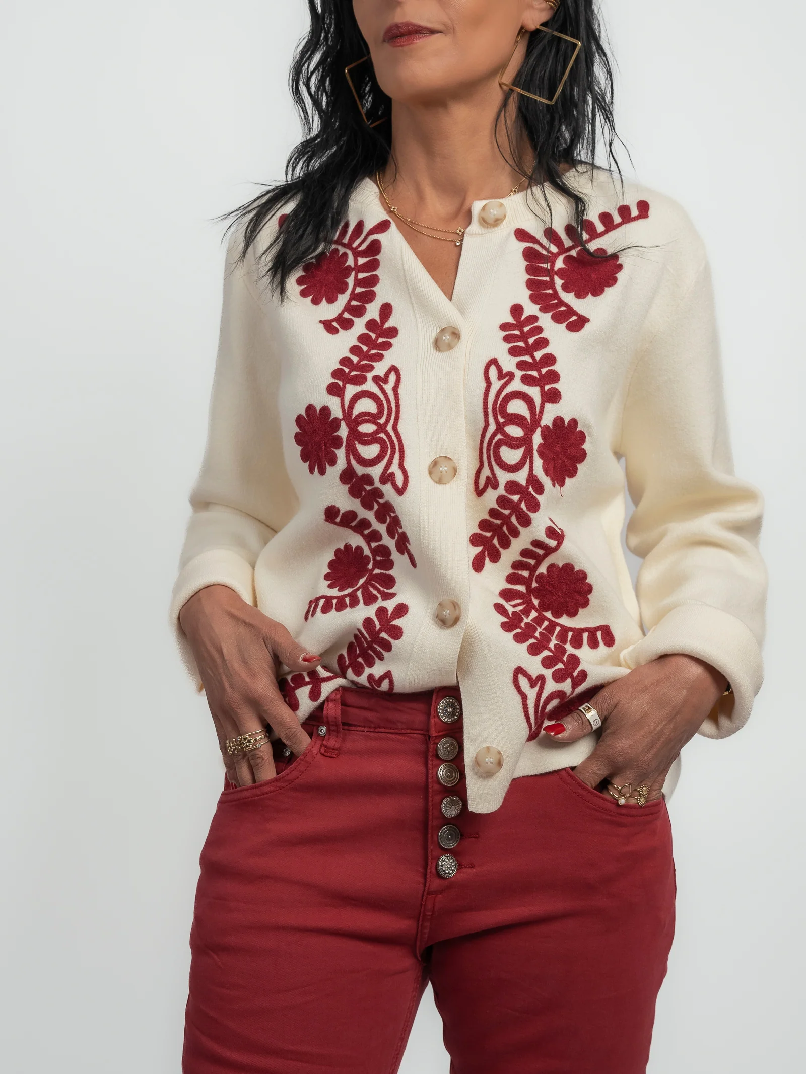 Élevez votre style avec le gilet écru Cynthia, sublimé par des broderies bordeaux, la couleur tendance du moment. Ce gilet raffiné associe une teinte neutre écru à des détails brodés bordeaux, apportant une touche moderne et élégante à votre garde-robe !