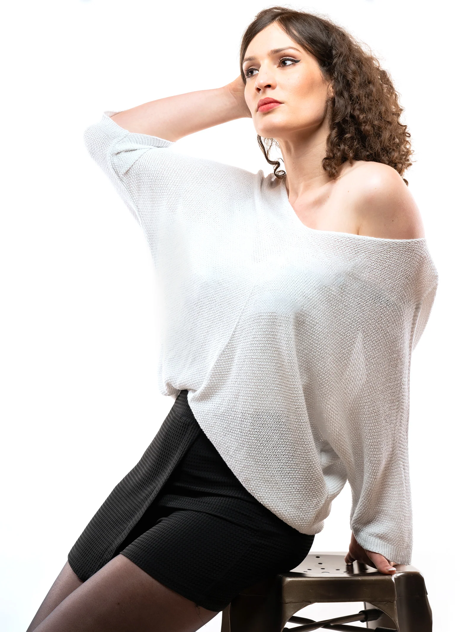 Découvrez le haut Aperol dans sa version blanche. On adore ses petits fils argentés qui le font briller, sa fibre modal qui le rend tout doux et ses manches 3/4 chauve-souris.