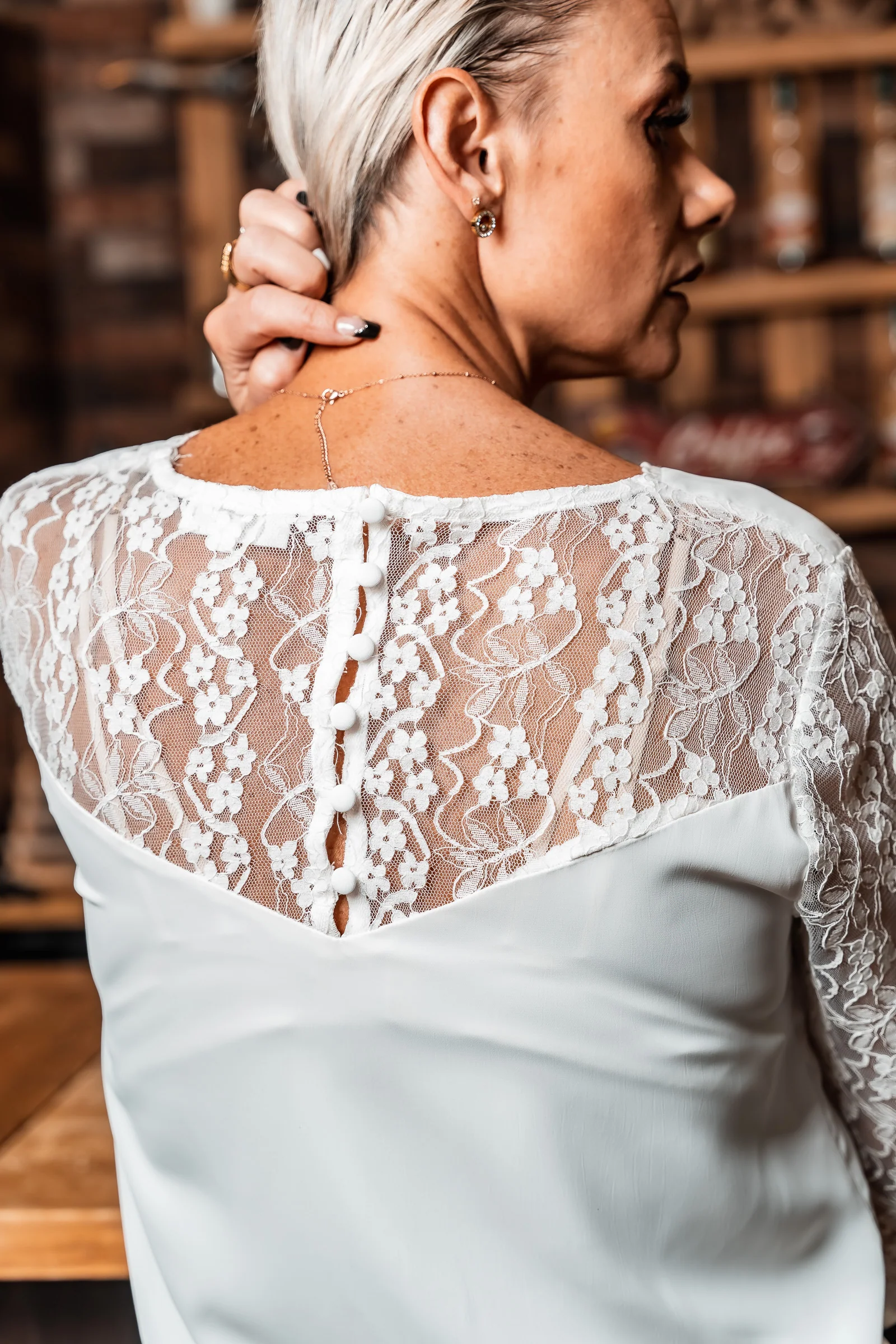 Composition : 100% polyester – Imprimé : aucun – Style : haut manches longues – Col : en V – Couleur : blanc – Boutons : dans le dos – Boutons manchettes : non – Asymétrie : non – Tailles existantes : S M L – Entretien : lavage à la main