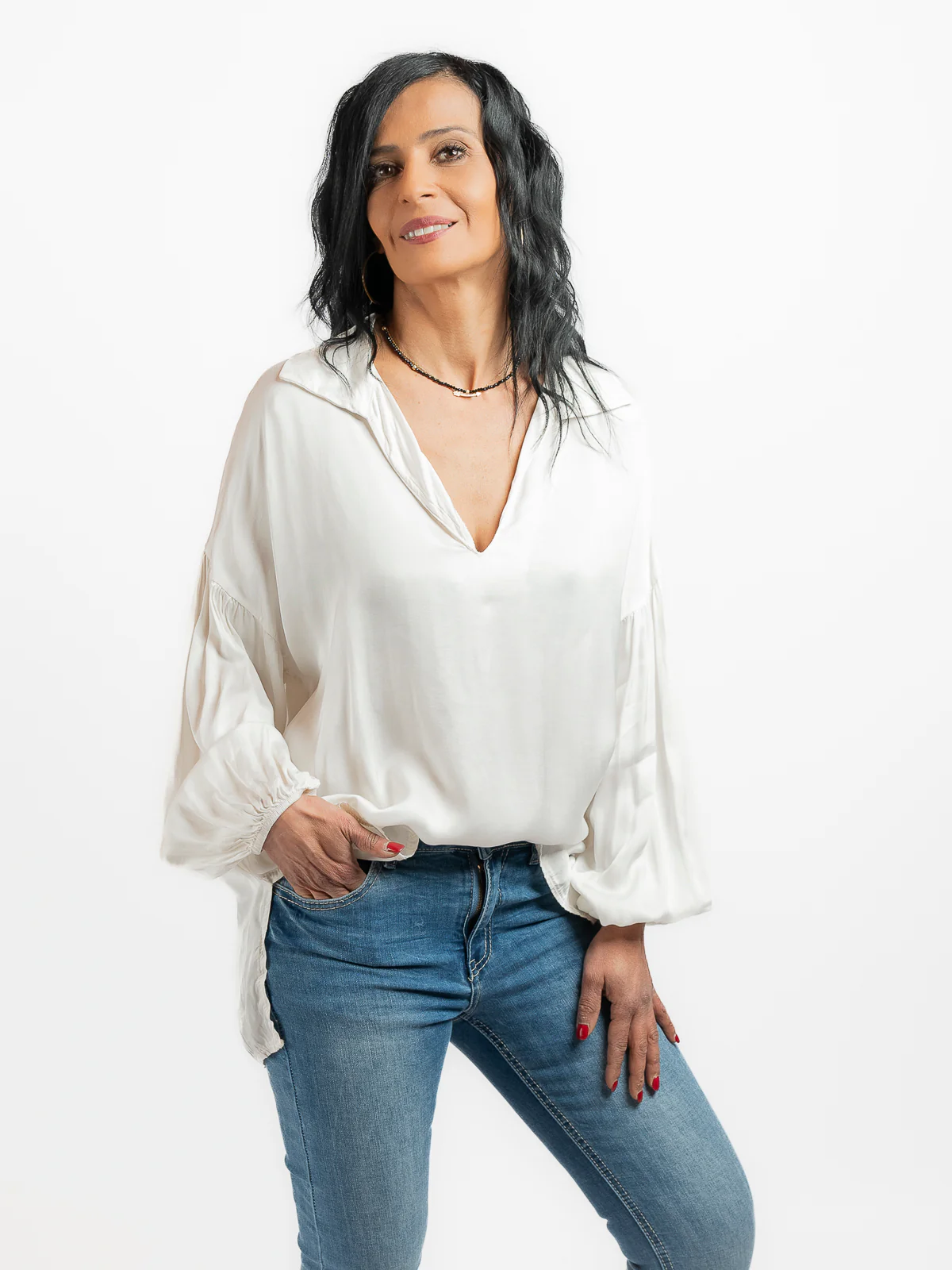 Composition : 61% rayon 39% viscose – Imprimé : aucun – Style : haut manches longues – Col : en V – Coupe : droite – Couleurs : blanc – Asymétrie : oui – Tailles existantes : Taille unique – Entretien : lavage à la main conseillé – Made in Italy