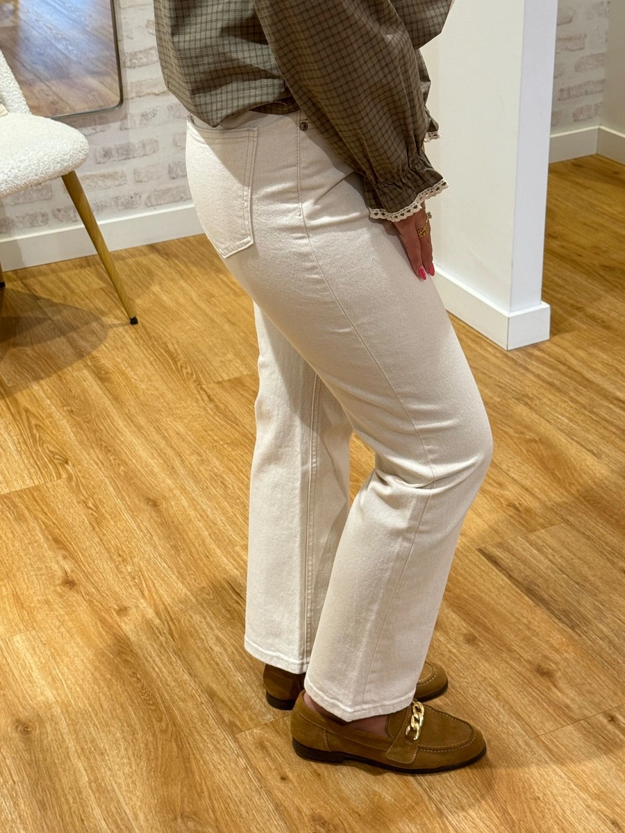 SOLANGE, le jean droit par excellence. Ce modèle a une coupe droite sur toute la jambe ce qui fait qu’il suit la cuisse sans la coller puis va rester droit sur le mollet ce qui donne un effet un peu large. C’est la pièce intemporelle qu’il faut absolument avoir.