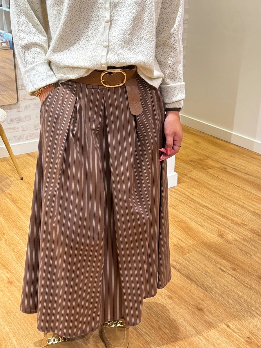 REINA, la jupe au style rétro revisité. On aime ses rayures fines, sa coupe évasée midi et ses plis marqués qui apportent mouvement et structure. Vous pouvez l’associer avec une maille ou un top uni.