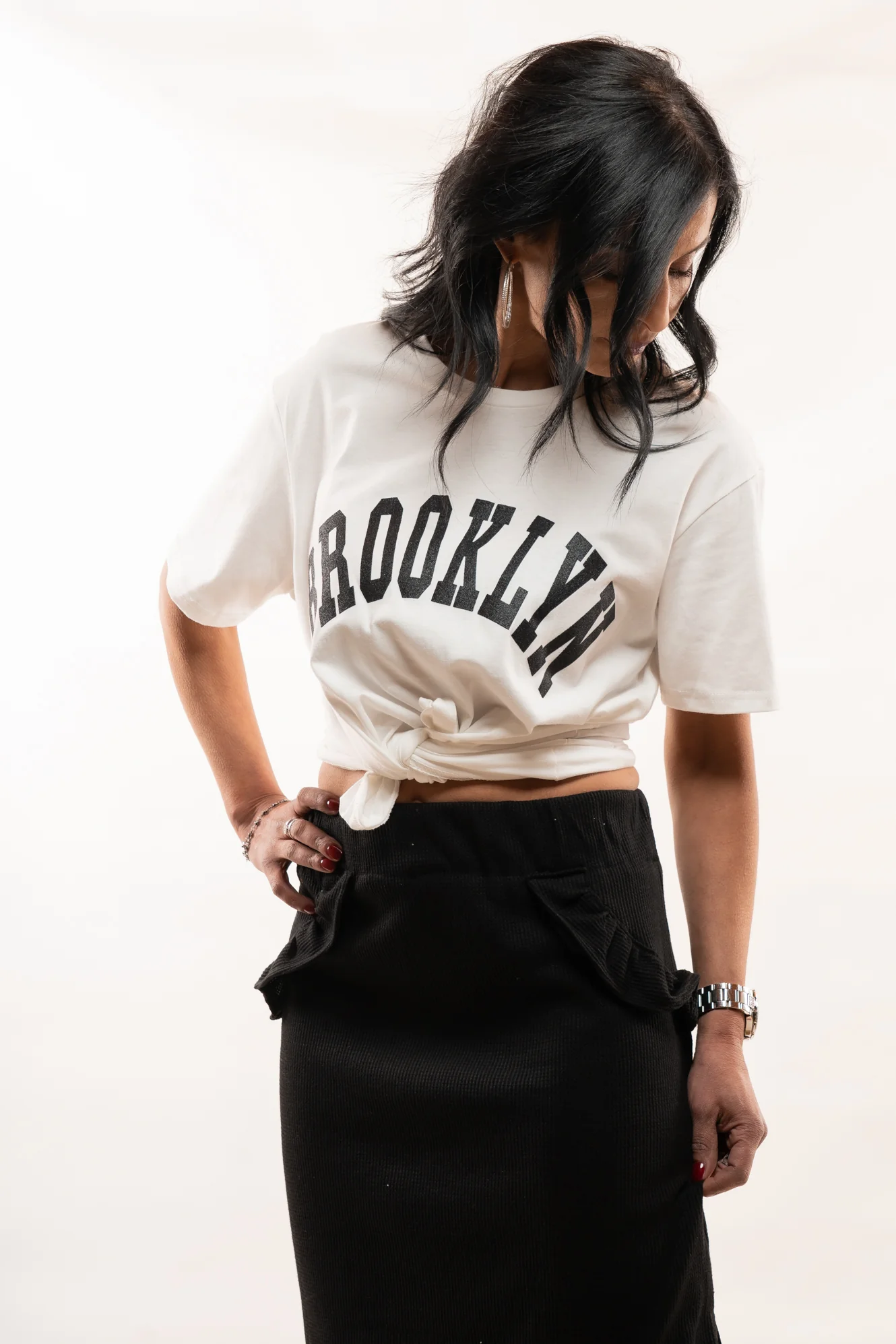 Découvrez la jupe longue Ariana dans sa version noire. On adore ses petits volants, son élastique à la taille, sa texture gaze de coton et ses côtés fendus qui lui donne une allure élégante.
