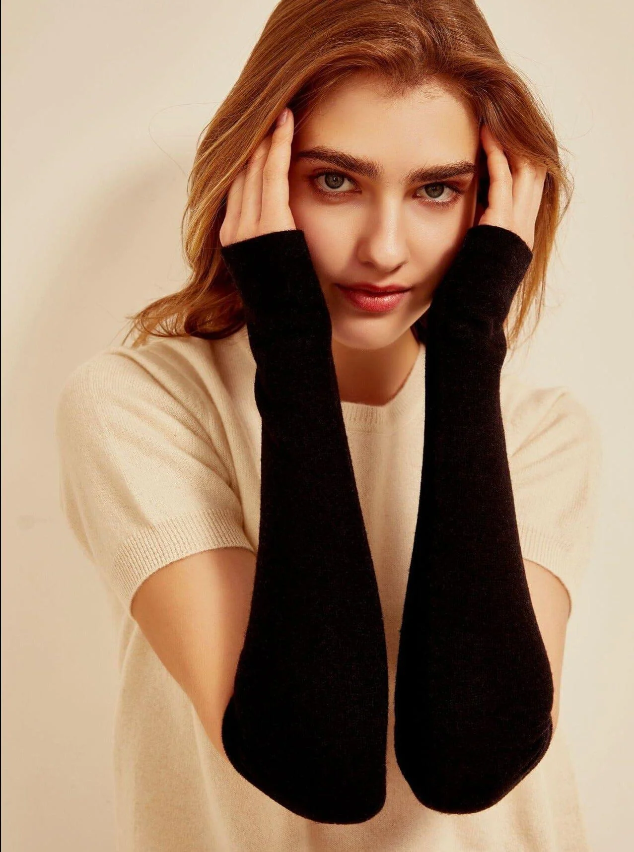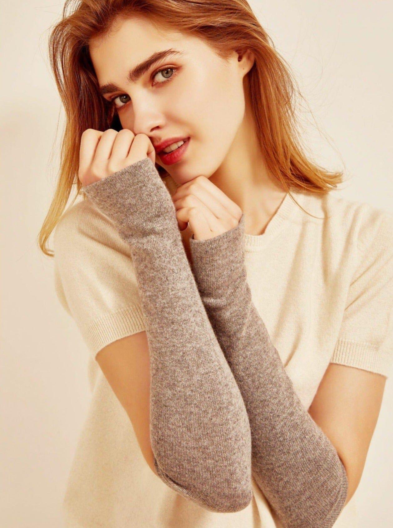 Mitaines longues en maille fine et douce avec passe-pouce. Conçues en laine mélangé à du cachemire. Disponibles en plusieurs coloris.