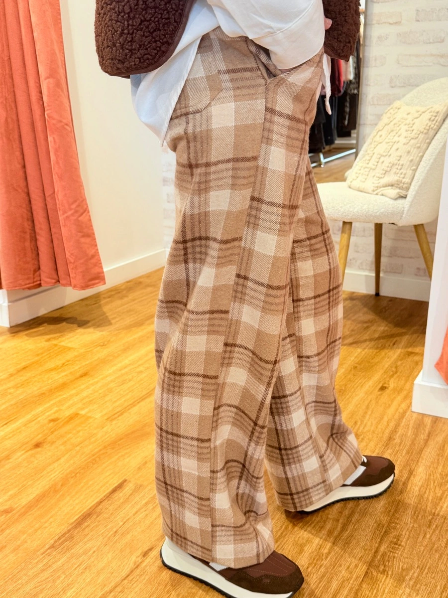 ALEXIS, le pantalon à carreaux aux teintes chaudes de camel et beige, parfait pour un look automnal chic et décontracté. Sa coupe ample et fluide assure un confort optimal tout en allongeant la silhouette.