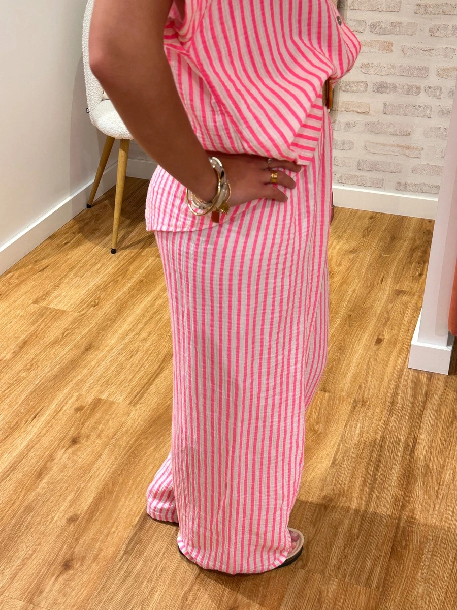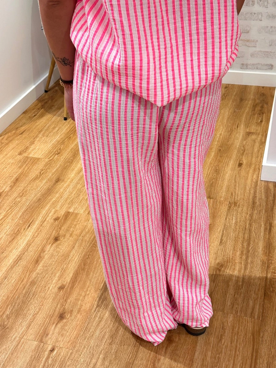 PIETRO, notre pantalon rayé blanc/fuchsia. On aime sa coupe souple, sa taille élastique et sa matière en gaze de coton ultra agréable.
