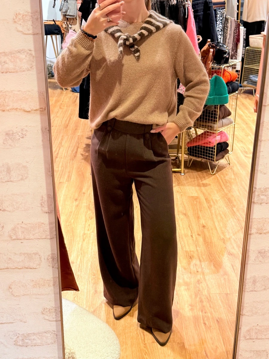 MAXENCE, le pantalon marron qui allie confort et élégance au quotidien. Sa coupe fluide allonge la silhouette tout en offrant une aisance incomparable. Avec sa taille haute, ses plis discrets à l’avant et ses jolis boutons ton sur ton, il apporte une touche chic.