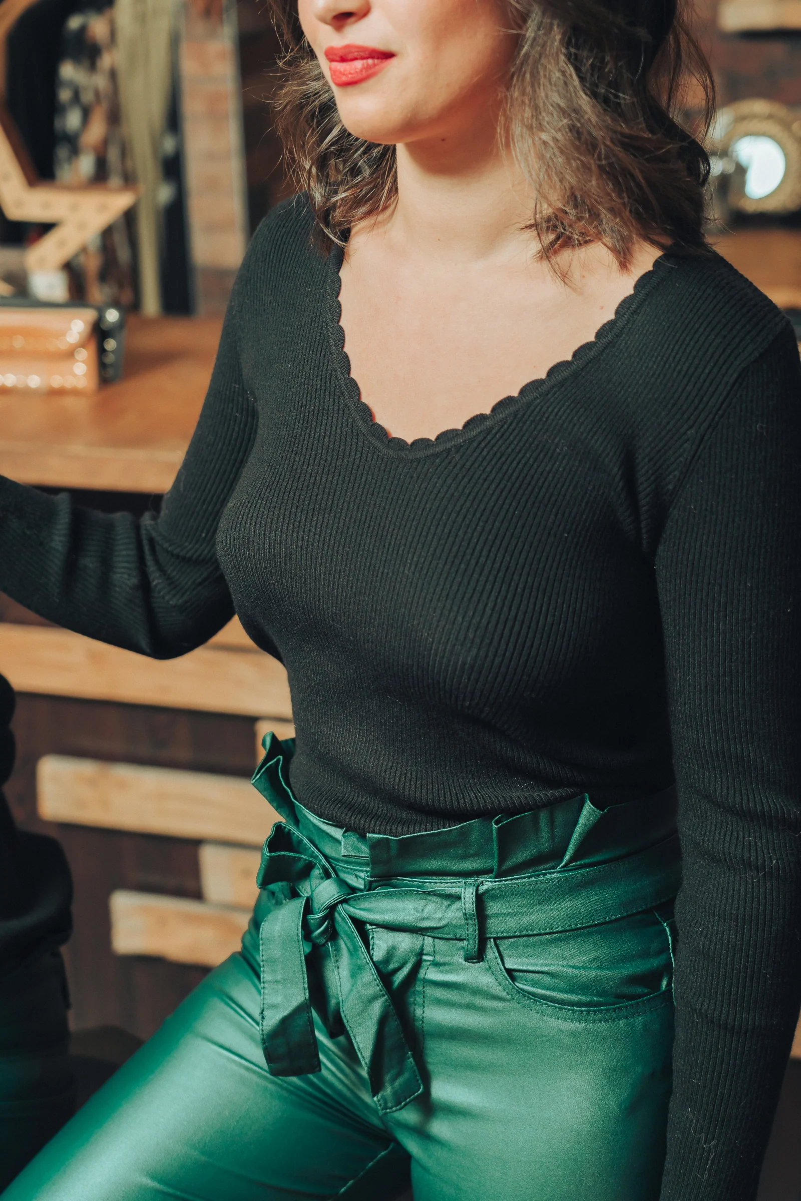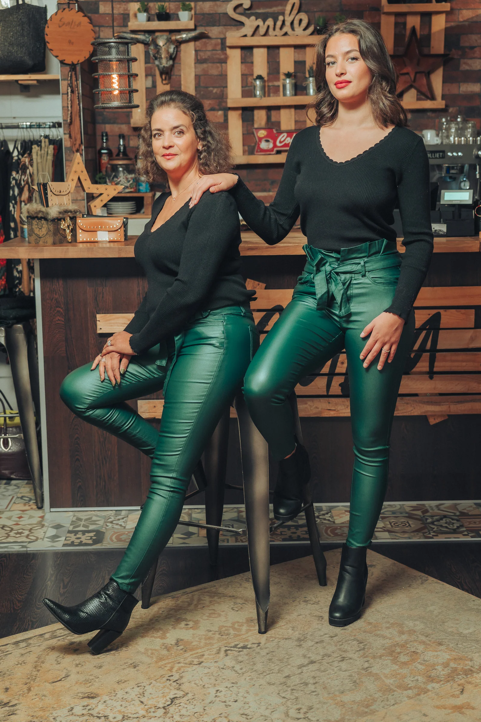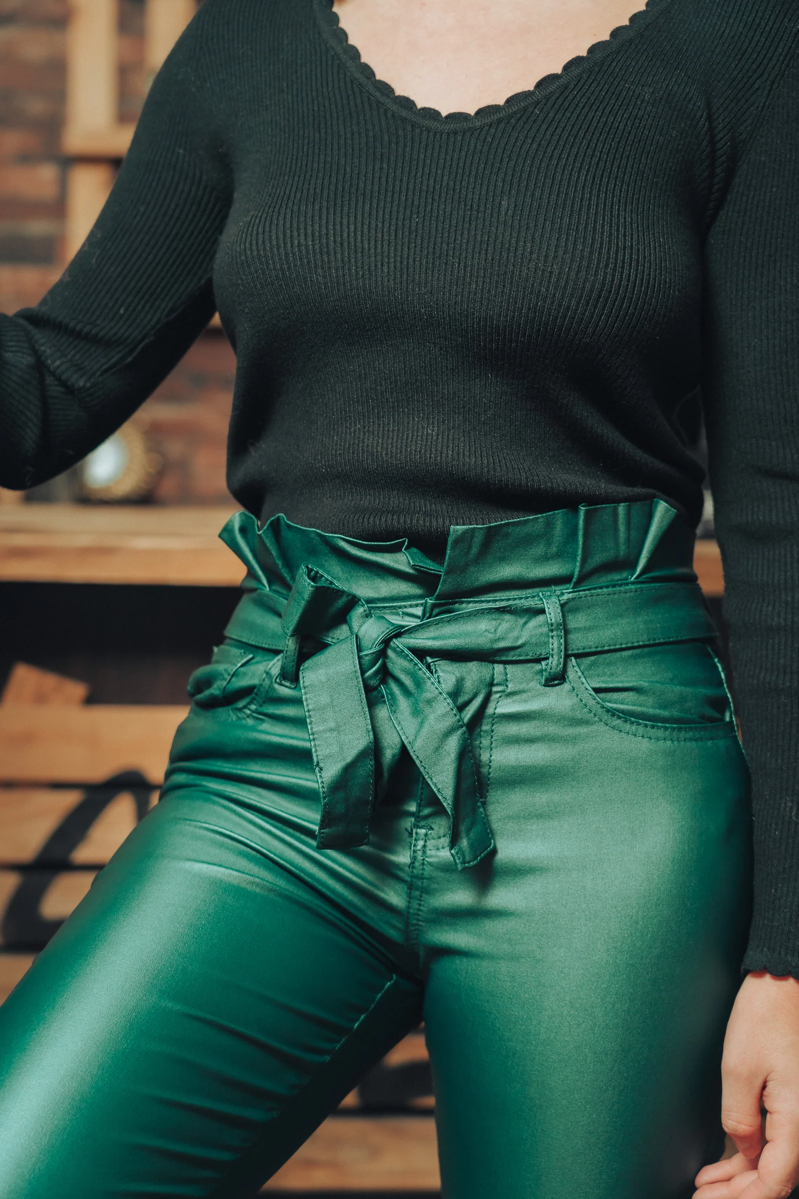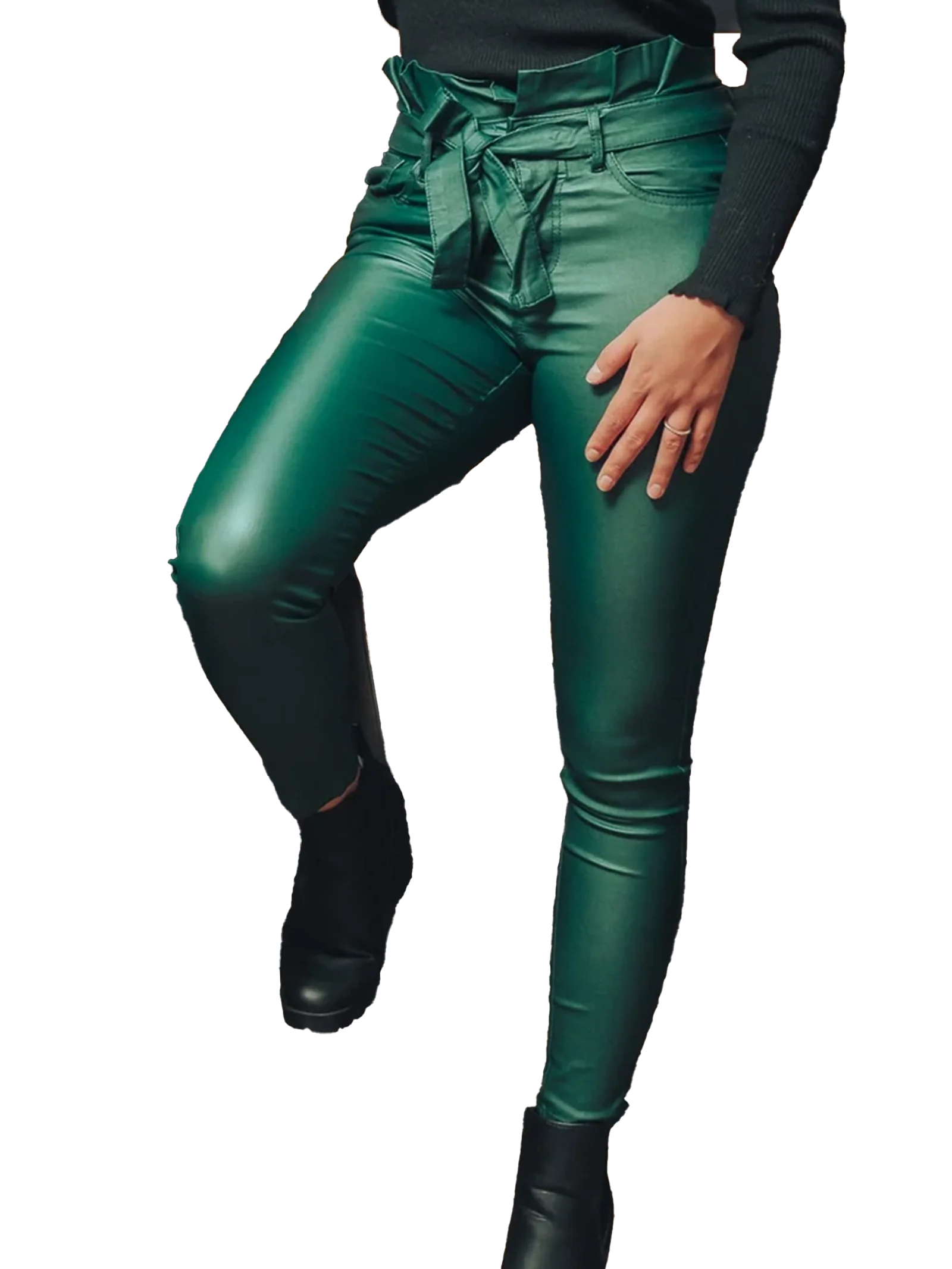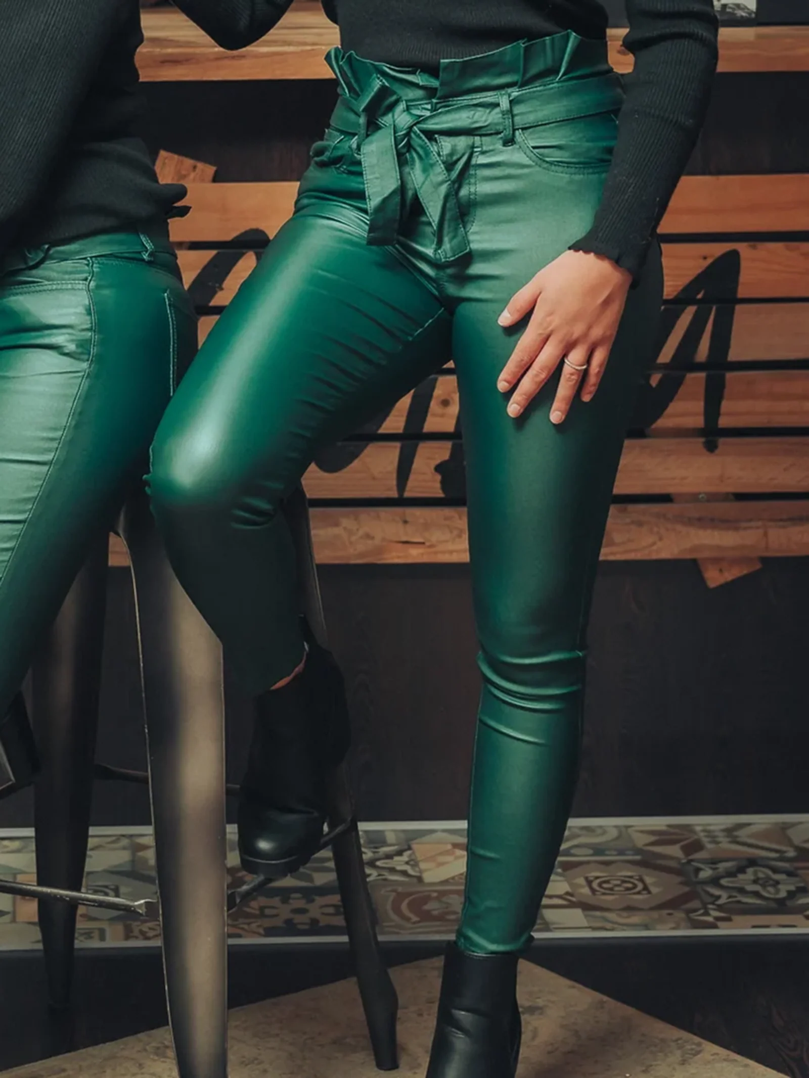Découvrez le pantalon taille haute simili Jerry. On adore son aspect premium sobre, sa couleur chaleureuse, son élasticité et sa ceinture à nouer.