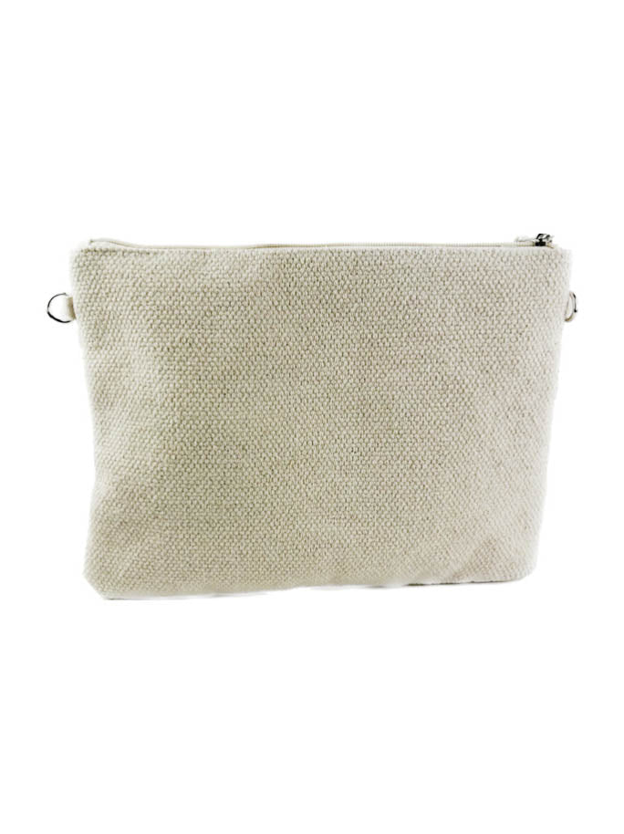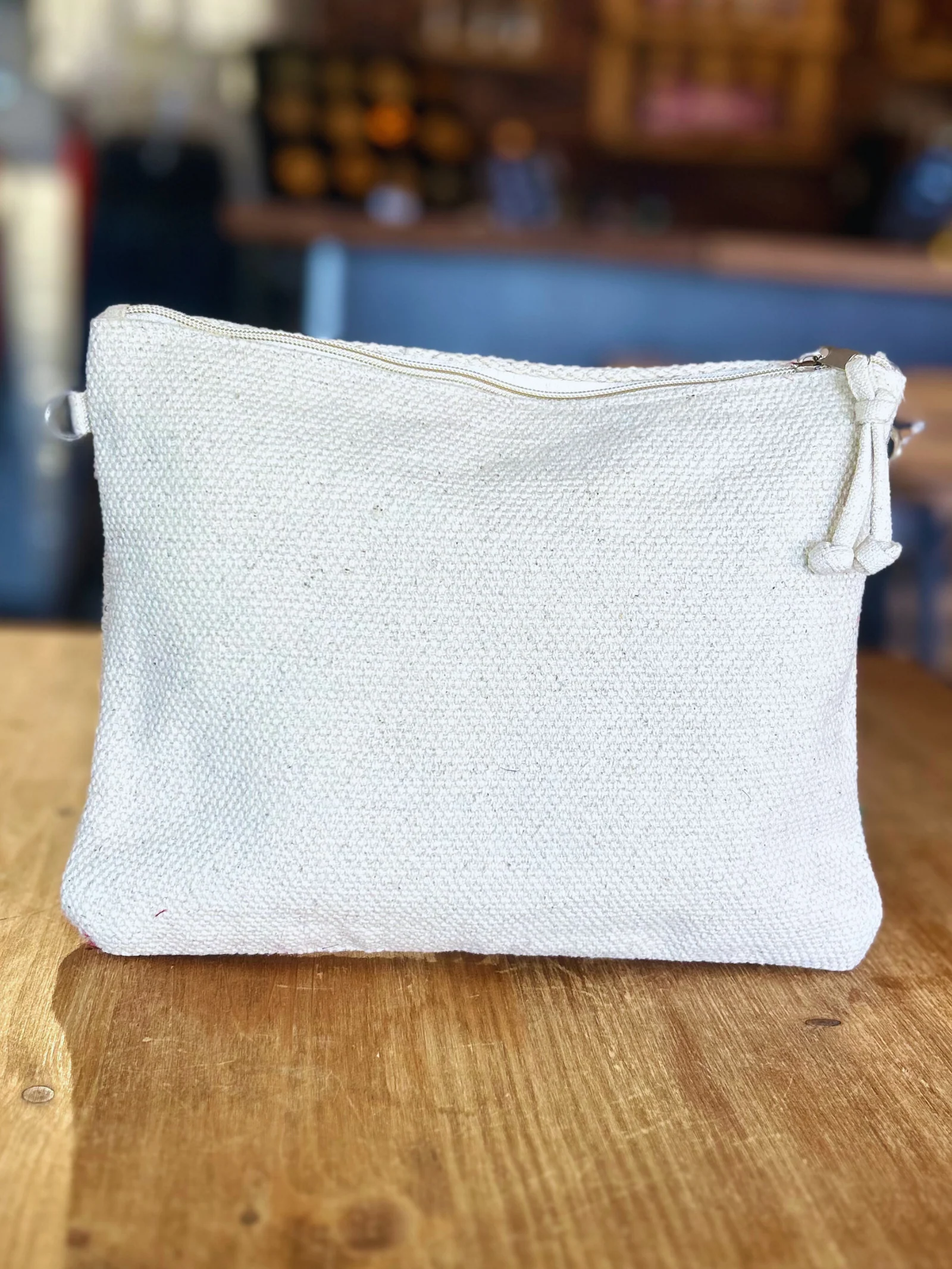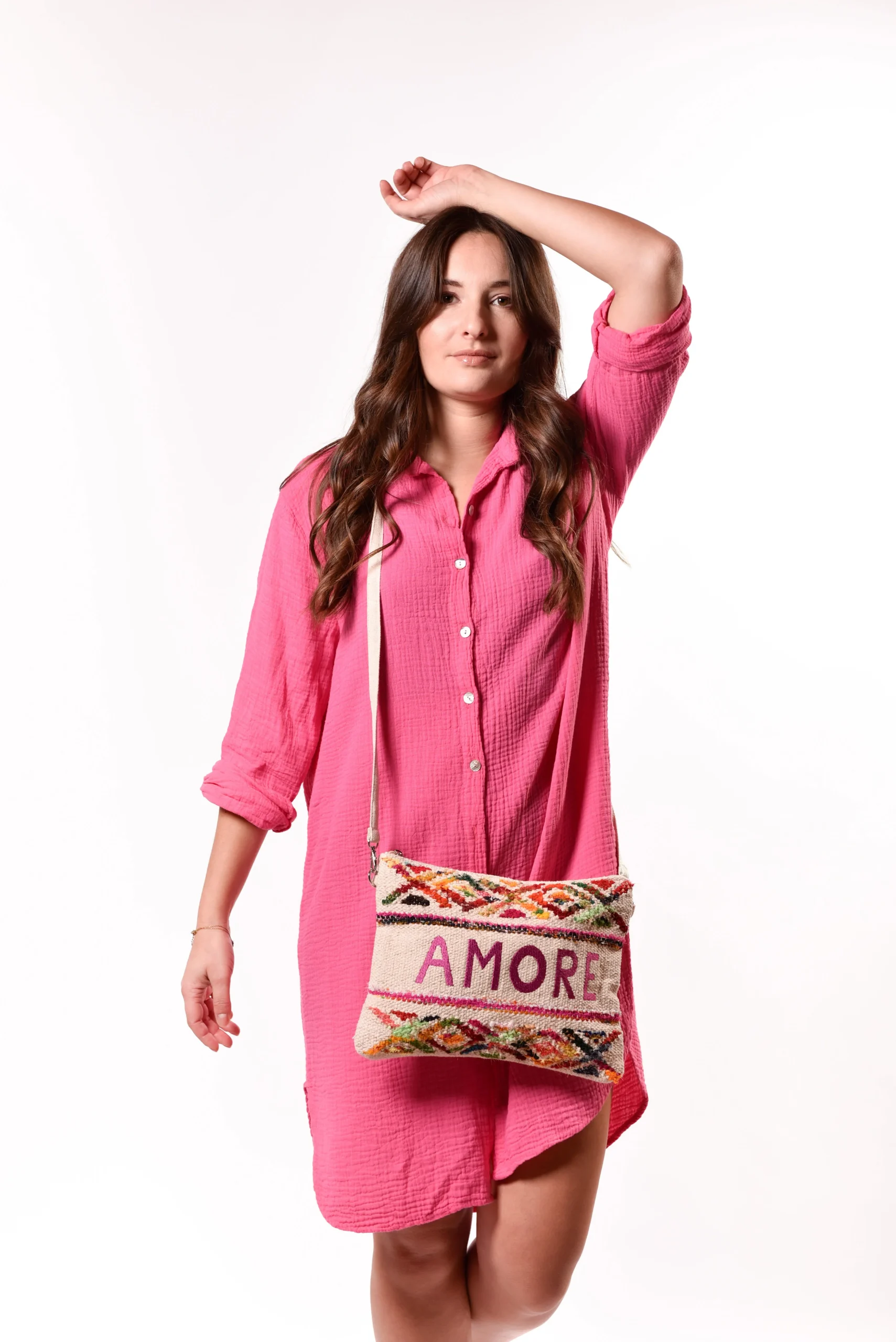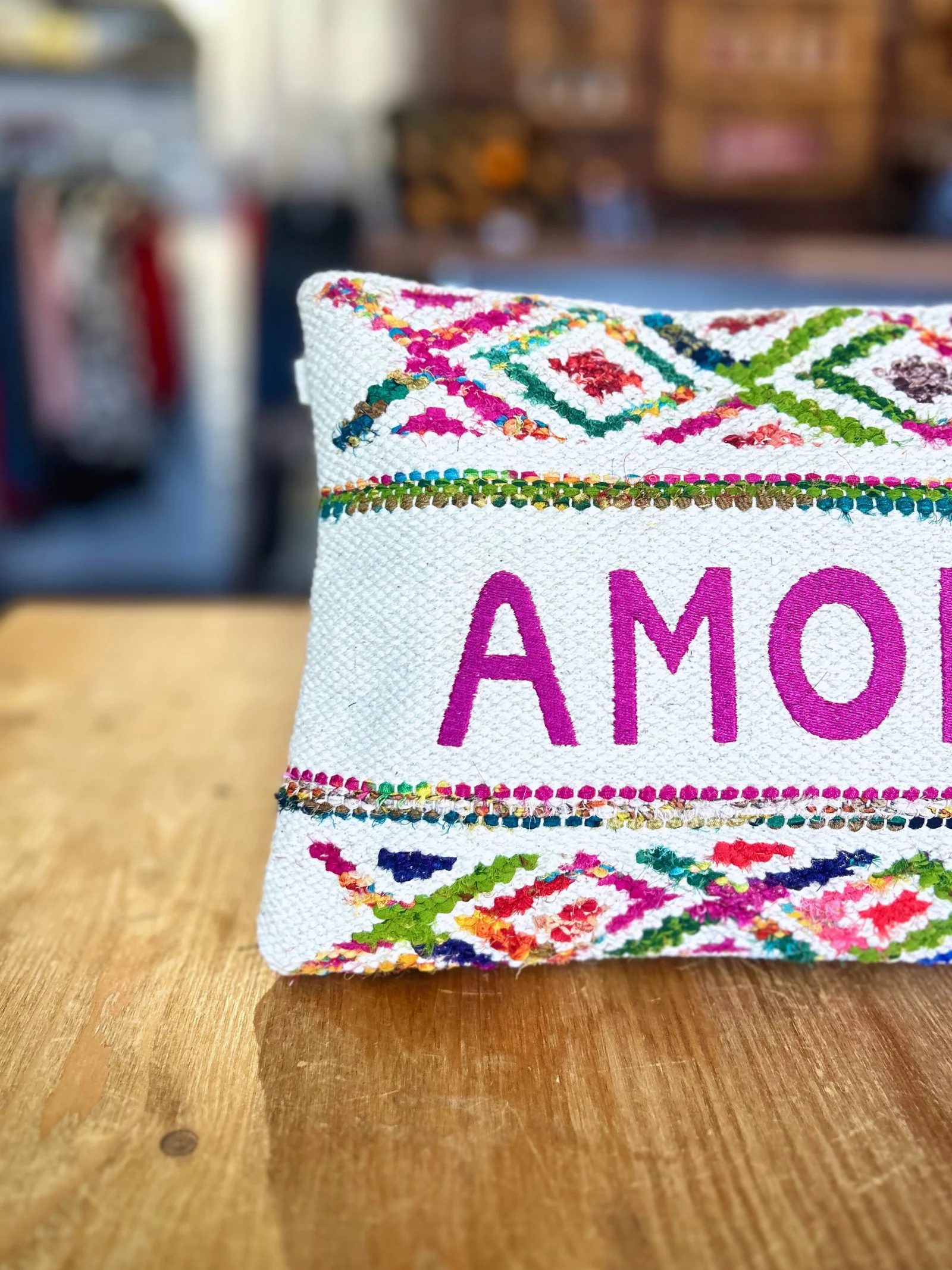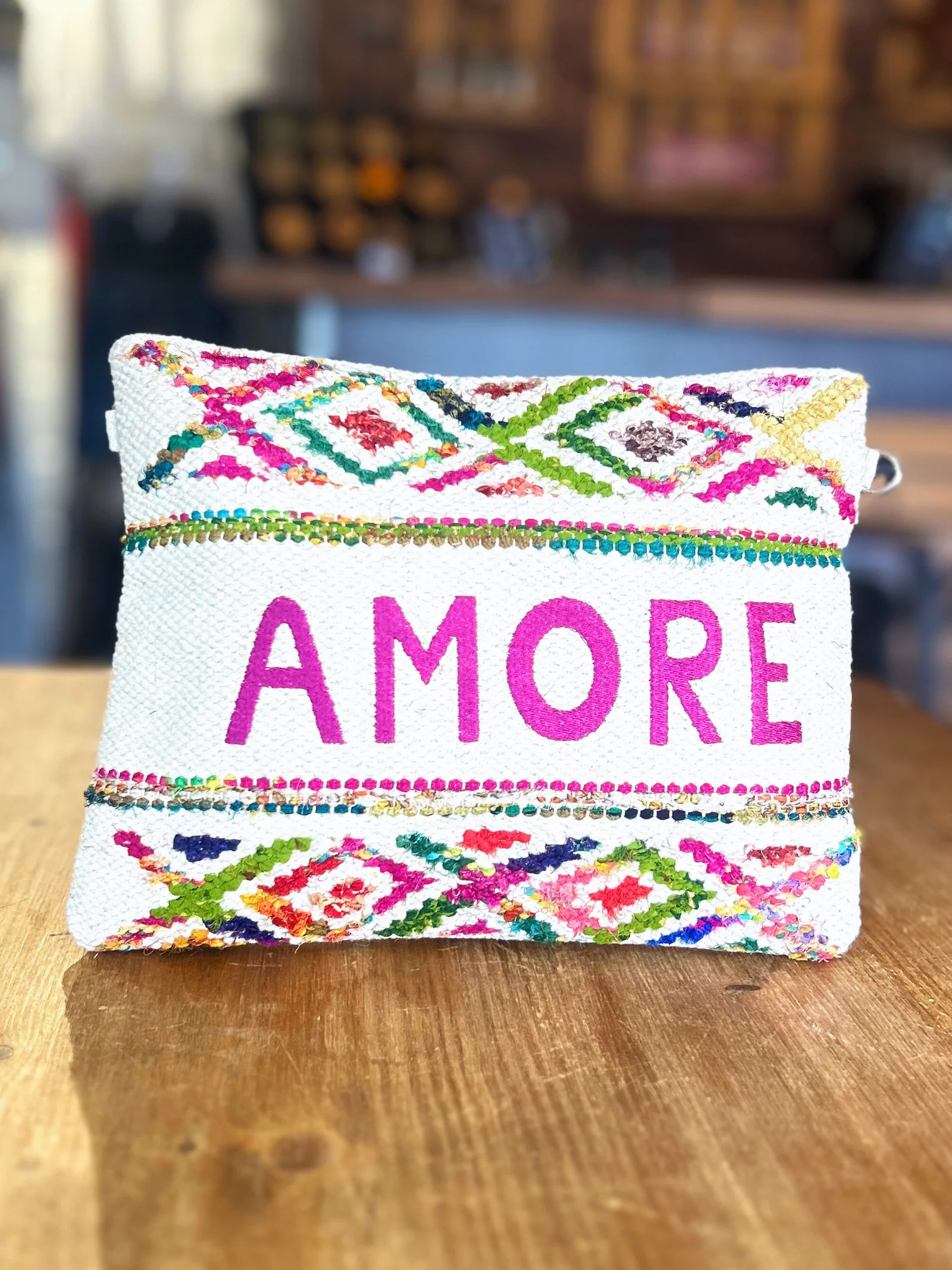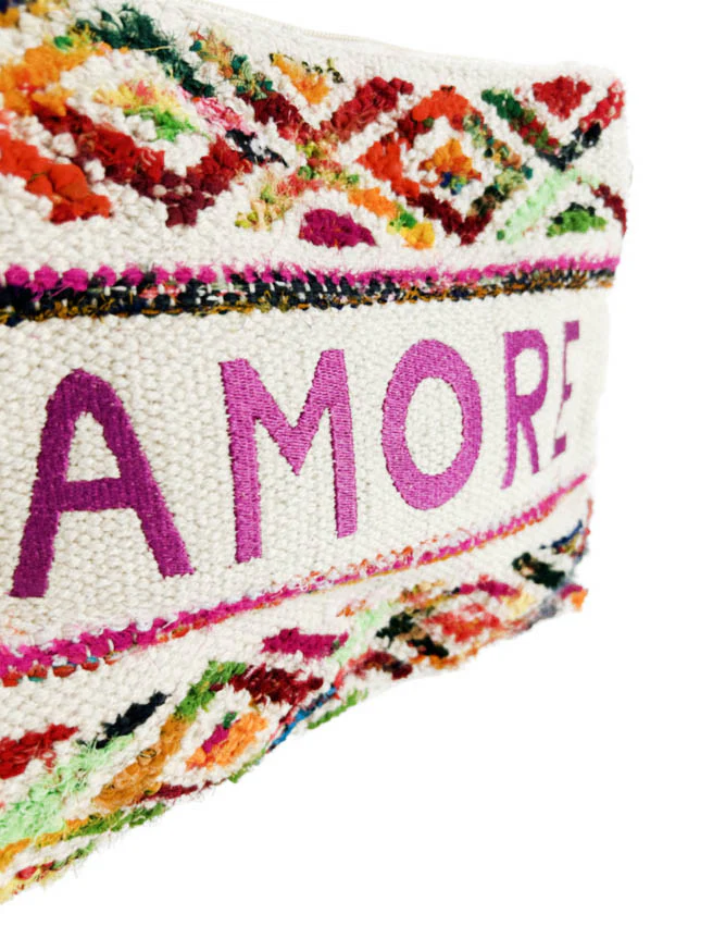 Découvrez la pochette tissée Amore et son message romantique. On aime son format pochette super pratique, sa grande contenance, sa composition tout coton, et son look ethnique estival.