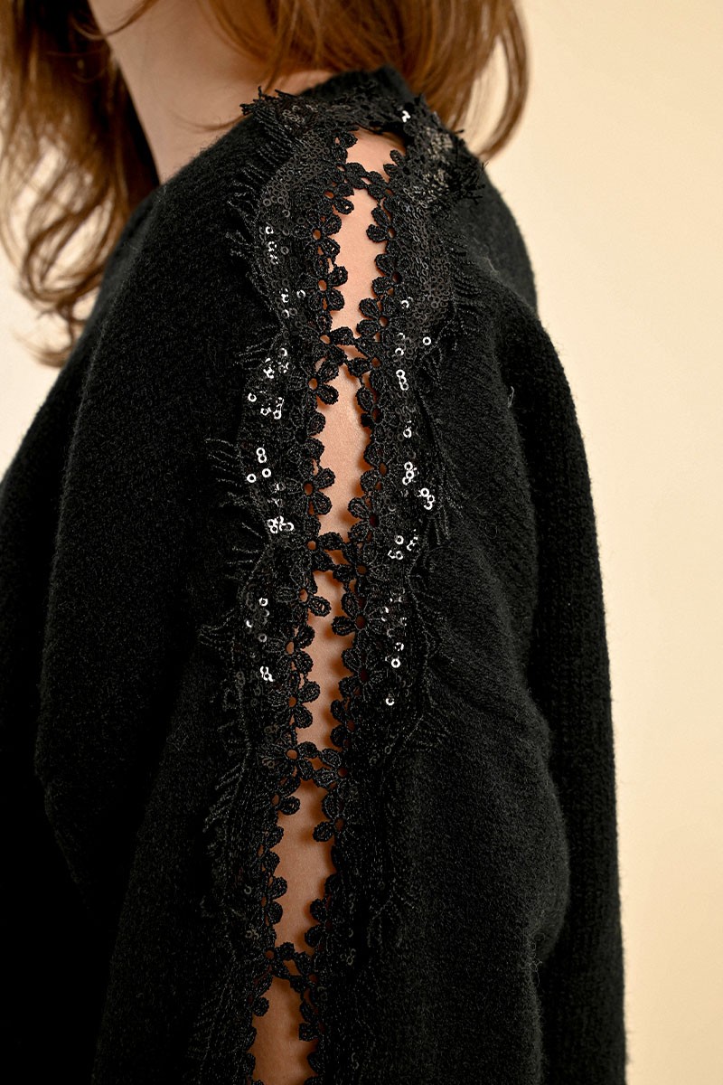 Les manches de ce pull sont ornées de fines finitions en dentelle sur les côtés. Ajoutant une touche de romantisme et de légèreté à l’ensemble. Ce détail délicat fait toute la différence. Rendant ce pull unique et idéal pour des occasions spéciales ou pour ajouter une touche chic à vos tenues du quotidien.