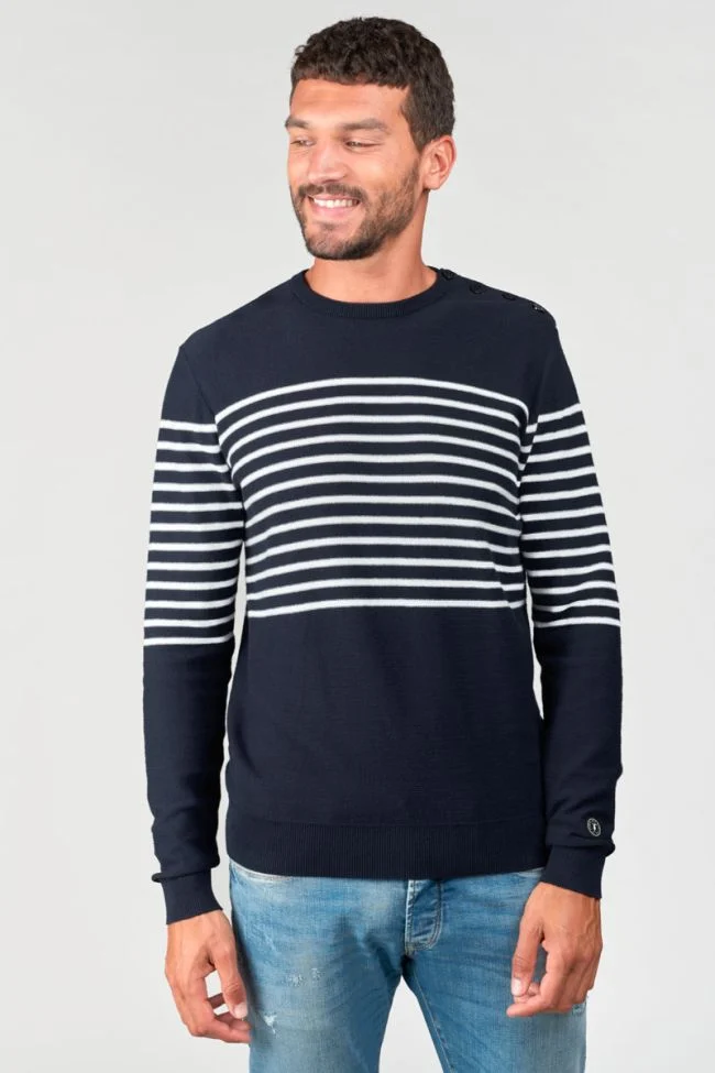 Bienvenue dans l’univers du Pull Oras de la marque Le Temps des Cerises. Une pièce incontournable pour l’homme moderne en quête d’élégance intemporelle et de confort. Ce pull en maille bleu marine, subtilement orné de fines rayures marinières blanches, incarne un équilibre parfait entre tradition et modernité. Il s’impose comme un choix idéal pour affirmer un style à la fois sobre, raffiné et résolument tendance.