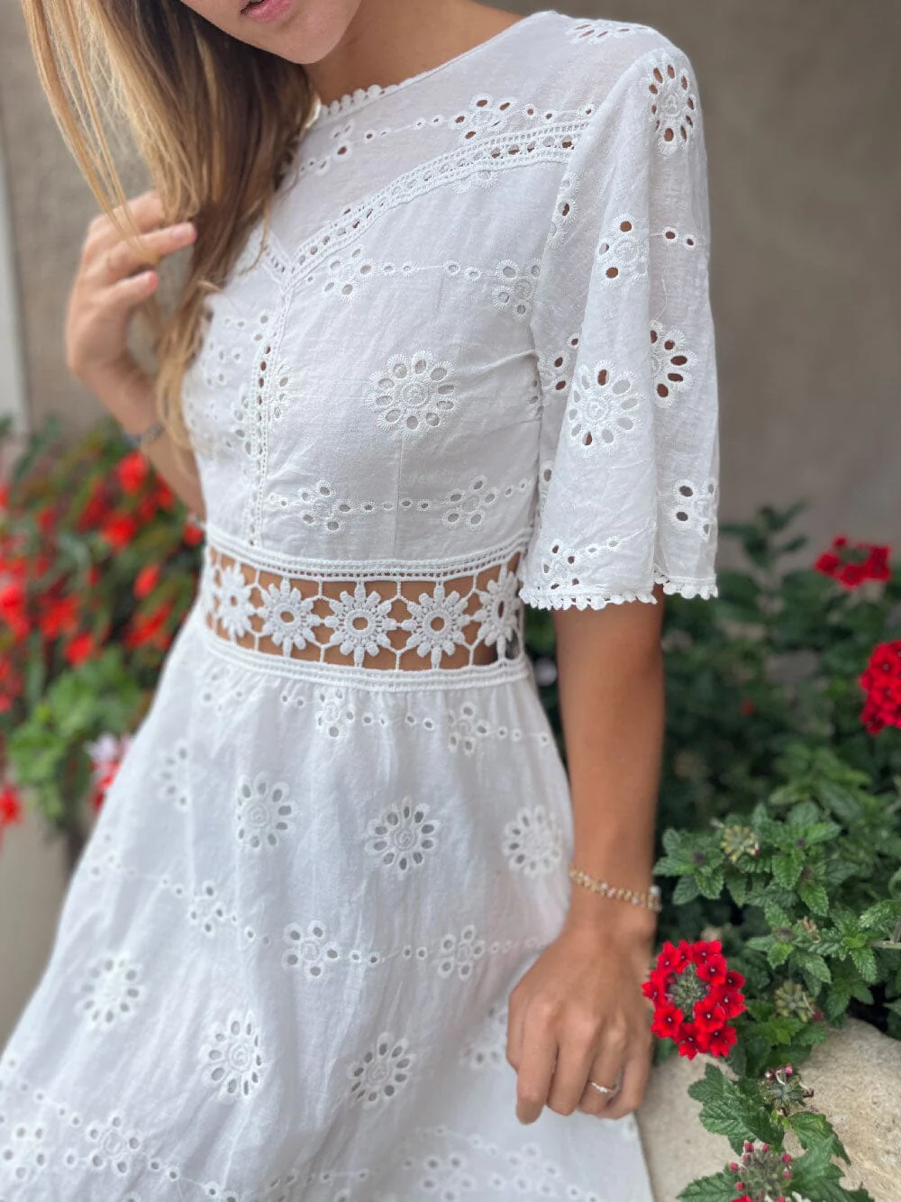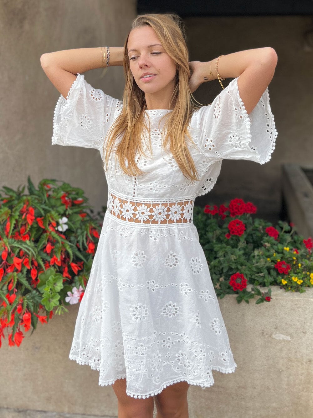 Robe blanche courte avec larges manches évasées. Modèle avec encolure en rond. Découpe à la taille avec une bande de dentelle incrustée. Jupe évasée avec à la base soulignée par une bande de pompons. Entièrement doublée.