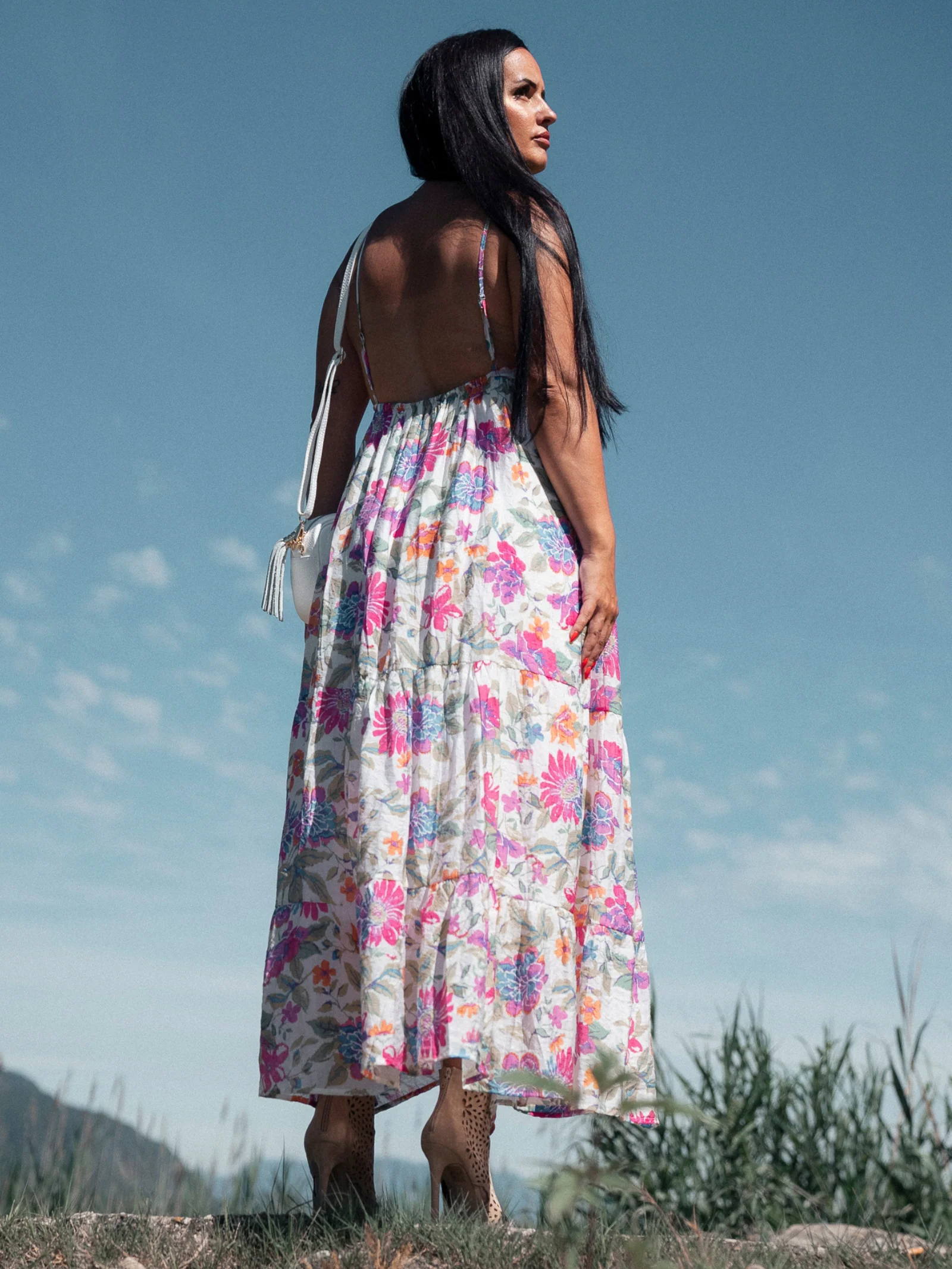 Les motifs fleuris délicats ajoutent une dimension poétique et féminine, tandis que le dos nu apporte une touche sensuelle et audacieuse. Idéal pour les soirées d’été et les mariages en plein air !