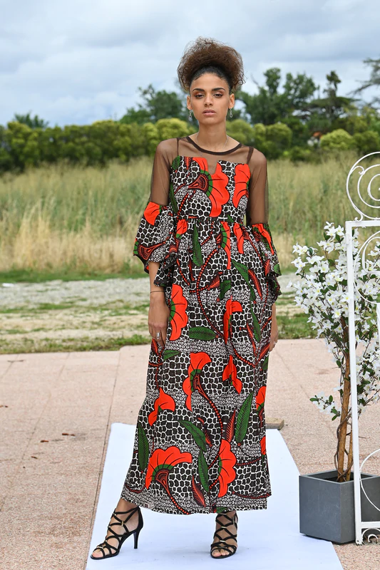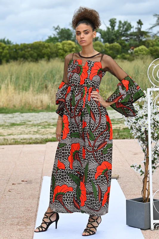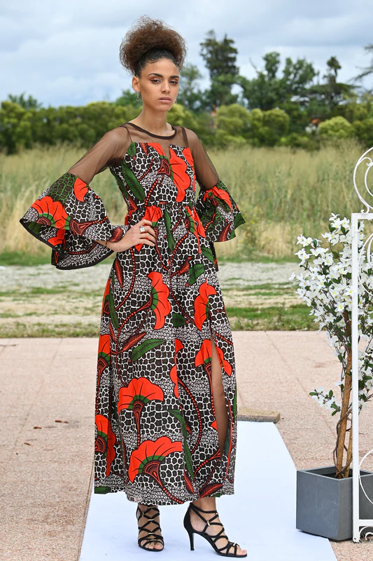 Robe longue en wax avec fente au niveau de la cuisse. Très chic, classe et à la fois sexy par sa touche transparente au niveau du dos, du buste et sur la moitié des manches qui se terminent par une découpe ovale.