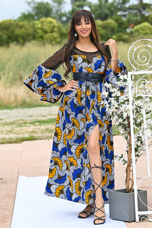 Robe longue en wax avec fente au niveau de la cuisse. Très chic, classe et à la fois sexy par sa touche transparente au niveau du dos, du buste et sur la moitié des manches qui se terminent par une découpe ovale.