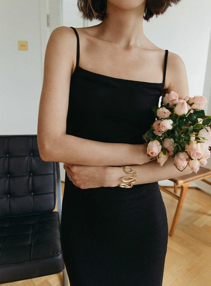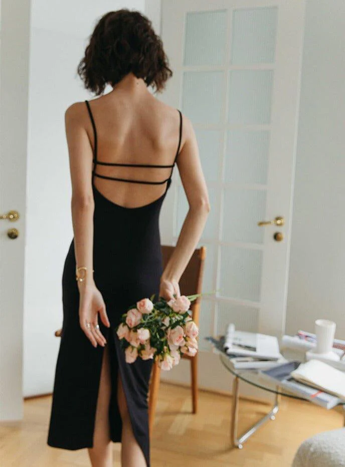 Robe longueur mi-mollet noire en coton mélangé, tombé fluide. Modèle élégant et confortable avec encolure droite et fines bretelles horizontales dans le dos partiellement ouvert. Base droite avec fente à l’arrière. Modèle idéal pour allier confort et séduction en toute simplicité.