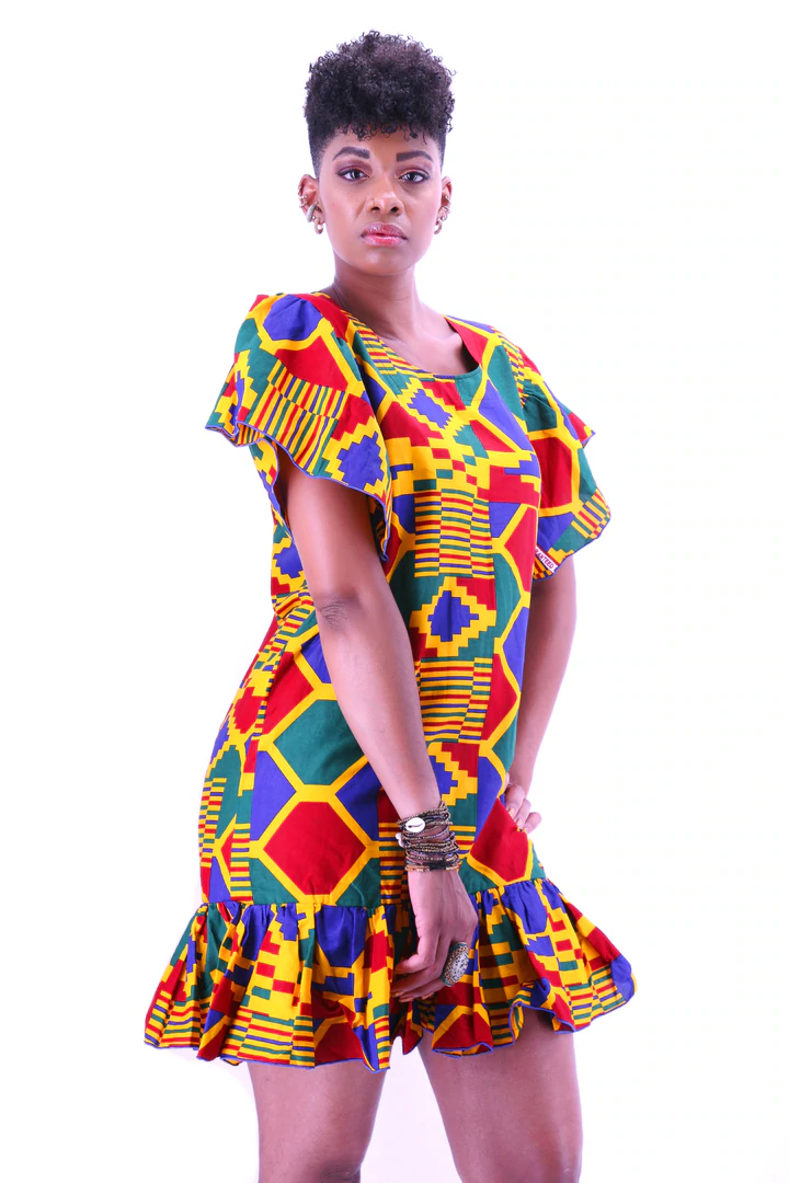 Robe courte froncée à col rond en wax. Très tendance ! Taille : M Couleur : multicolore