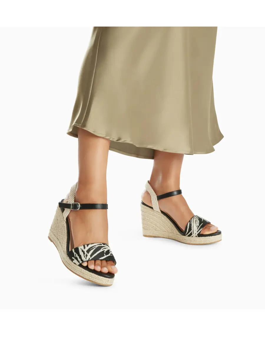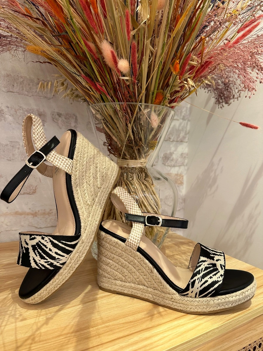 HONORINE, la paire de sandales compensées à bride en tissu jacquard noir et beige. On aime l’élégance de cette paire de sandale.
