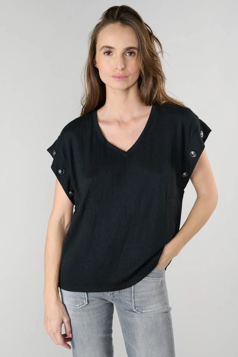 Découvrez l’élégance intemporelle et la simplicité raffinée du T-shirt Narciss de la marque Le Temps des Cerises. Une pièce essentielle pour toutes celles qui recherchent un vêtement à la fois féminin, confortable et tendance. Confectionné avec un grand soin. Ce t-shirt à manches courtes se distingue par sa matière côtelée noire qui épouse délicatement les formes sans jamais contraindre. Son tissu doux et respirant garantit un confort optimal tout au long de la journée. Tout en conservant une tenue impeccable.