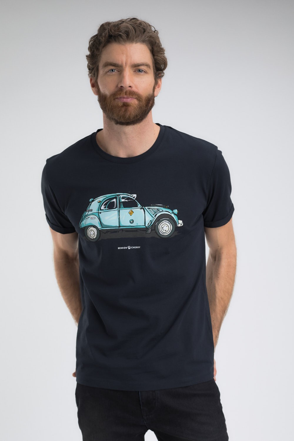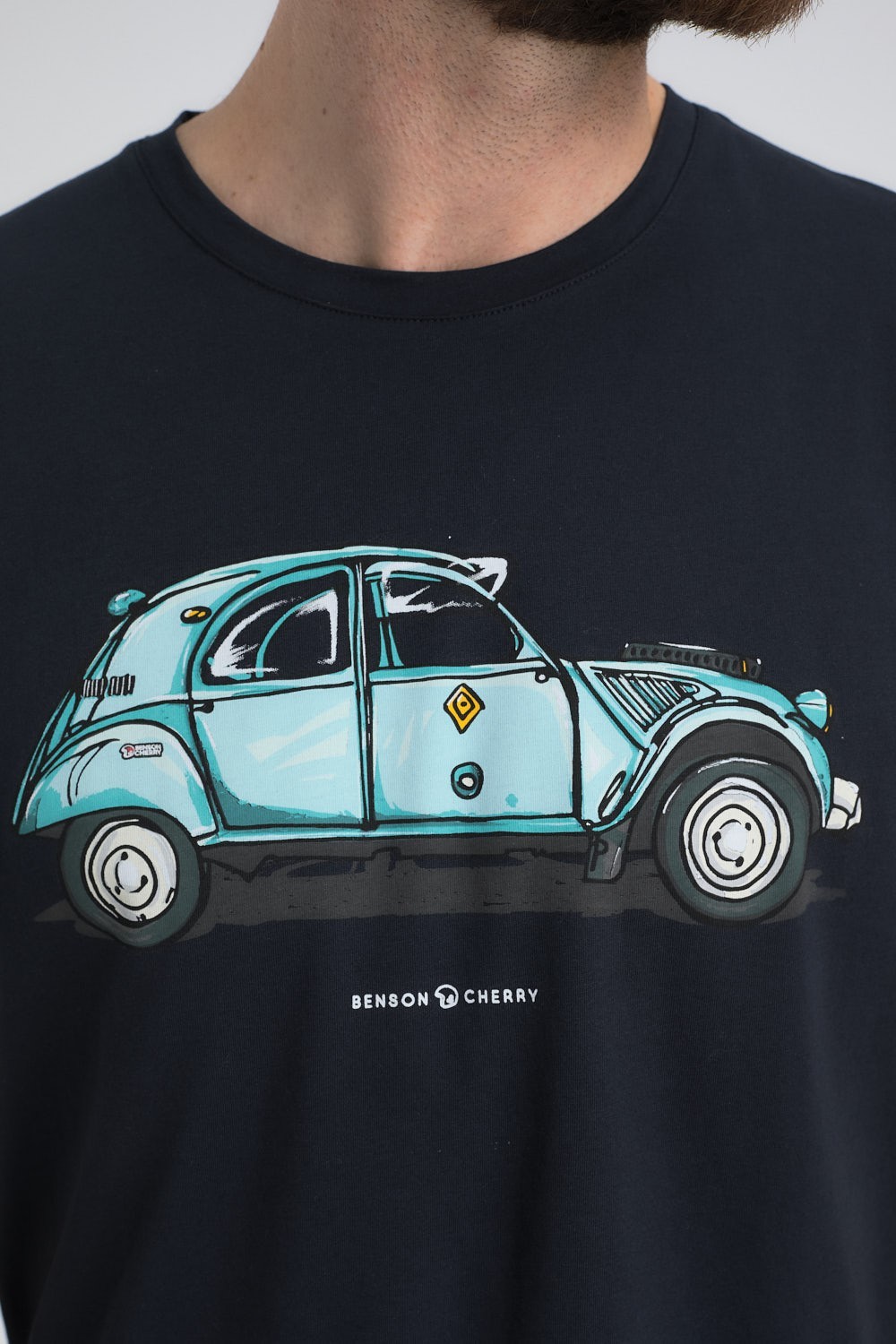 L’élément central du design est une impression graphique originale d’une 2CV bleue. Placée au centre de la poitrine. Cette illustration vintage ajoute une note rétro et authentique à ce tee-shirt. Tout en reflétant l’esprit créatif et moderne de Benson and Cherry. En dessous, le logo discret de la marque souligne l’attention portée aux détails sans surcharger le visuel.