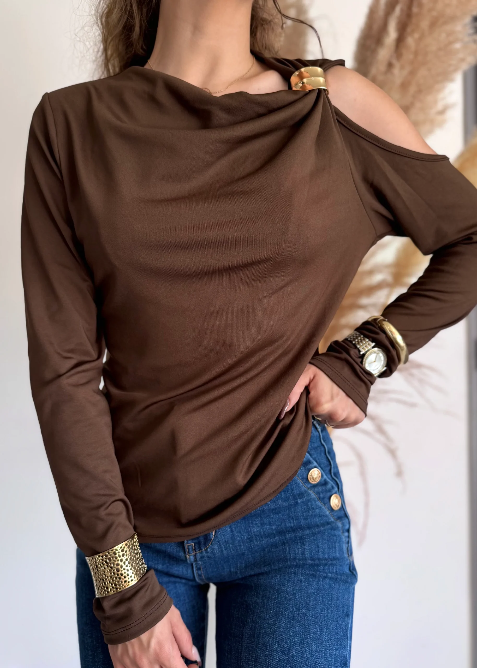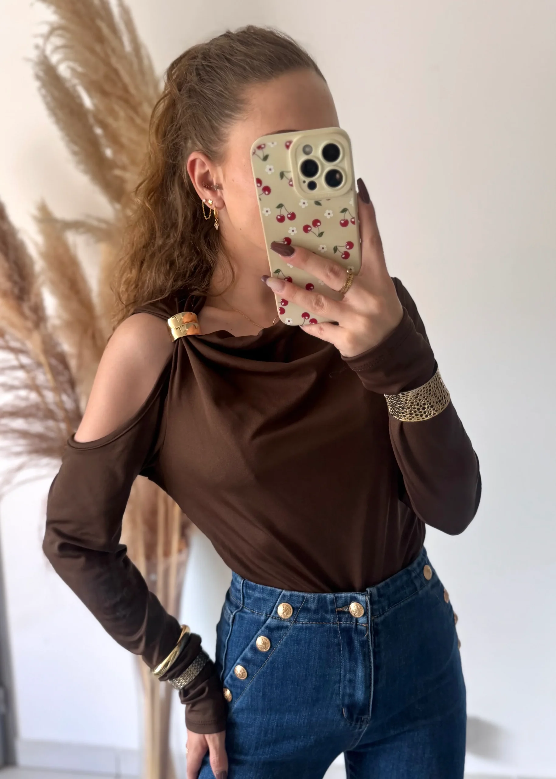 Ce top se distingue par son design asymétrique ultra féminin : une épaule subtilement dénudée et un détail anneau doré qui apporte une touche sophistiquée et moderne. Confectionné dans une matière douce et fluide, il allie confort et élégance, parfait pour les occasions où l’on veut se sentir chic sans effort.