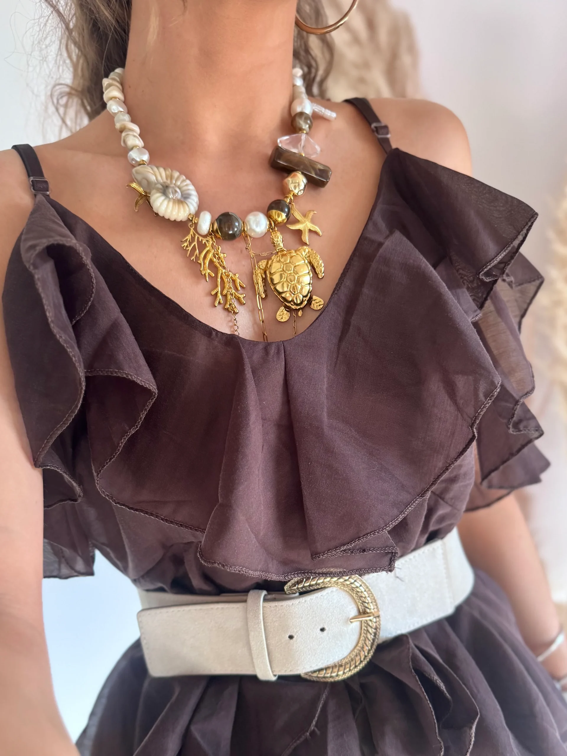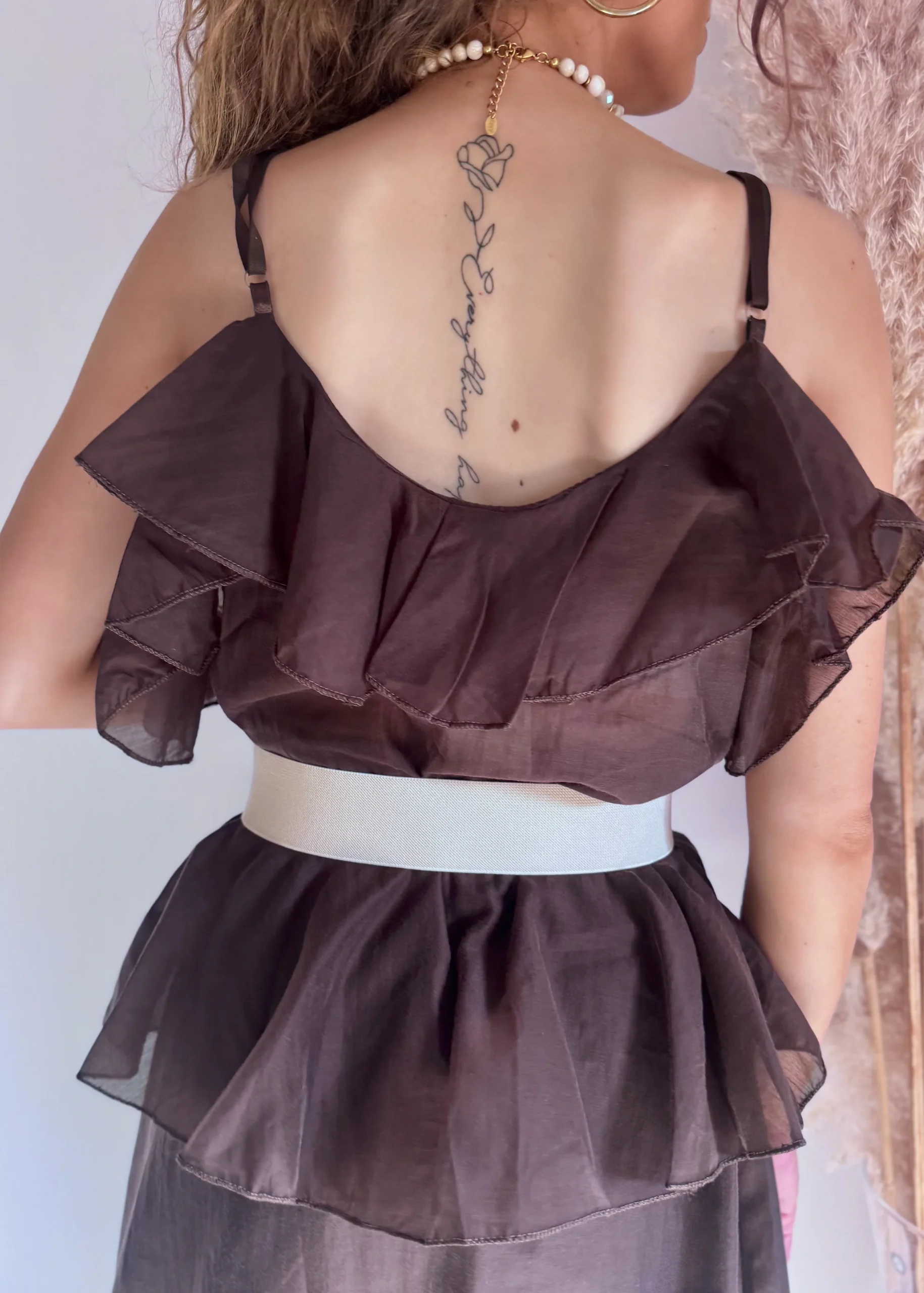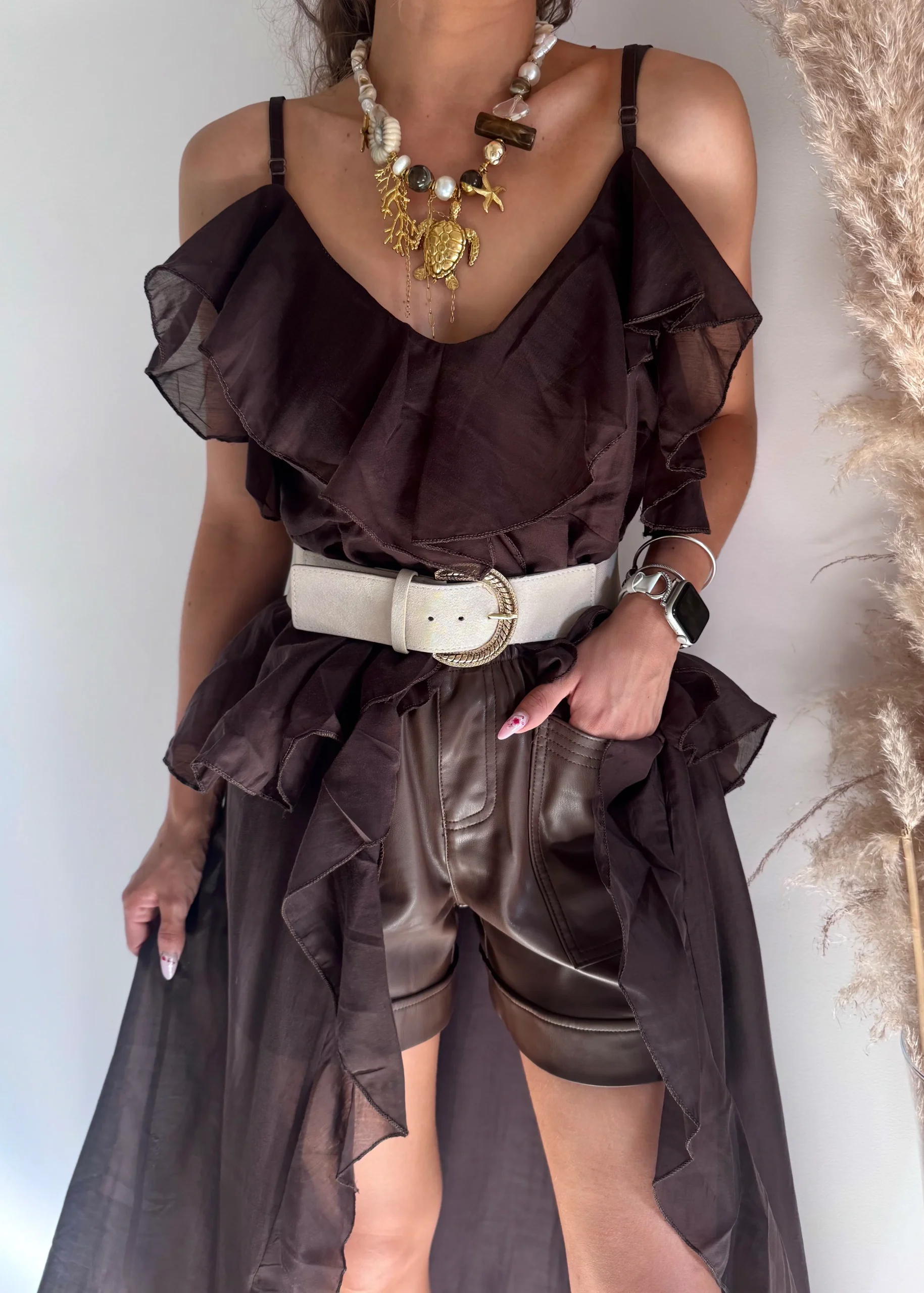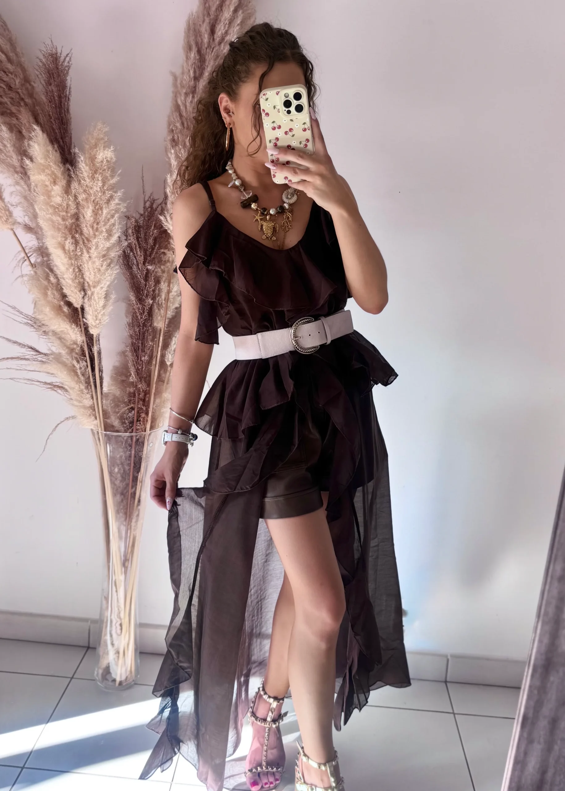 Audacieuse et aérienne, Bruna joue avec les volumes et les longueurs pour une allure aussi féminine qu’originale. Court à l’avant, plus long à l’arrière, ce haut asymétrique à volants accompagne chaque mouvement avec fluidité. Sa teinte chocolat intense, ultra tendance cette saison, lui donne une touche chic et chaleureuse, tandis que ses fines bretelles dévoilent les épaules avec délicatesse.