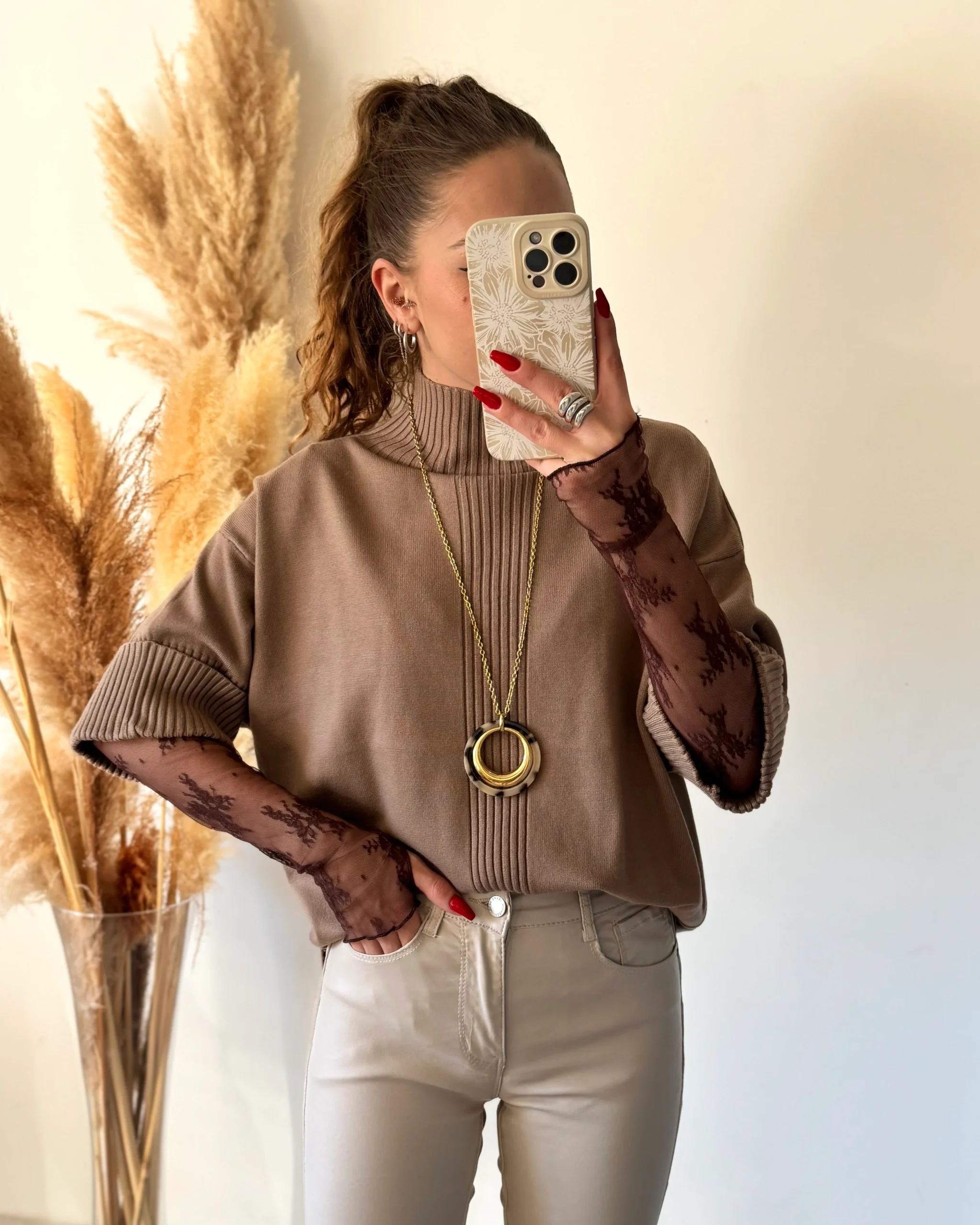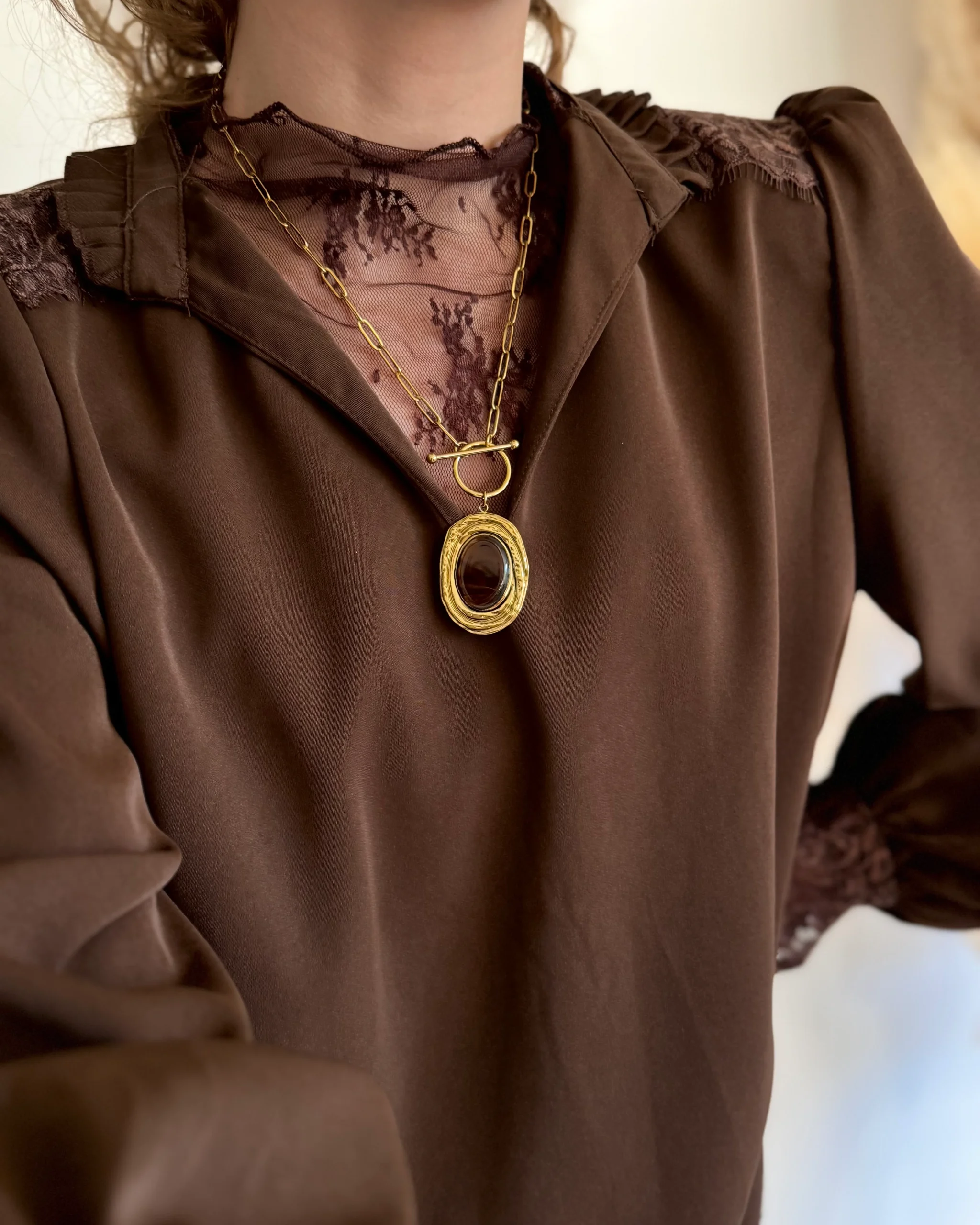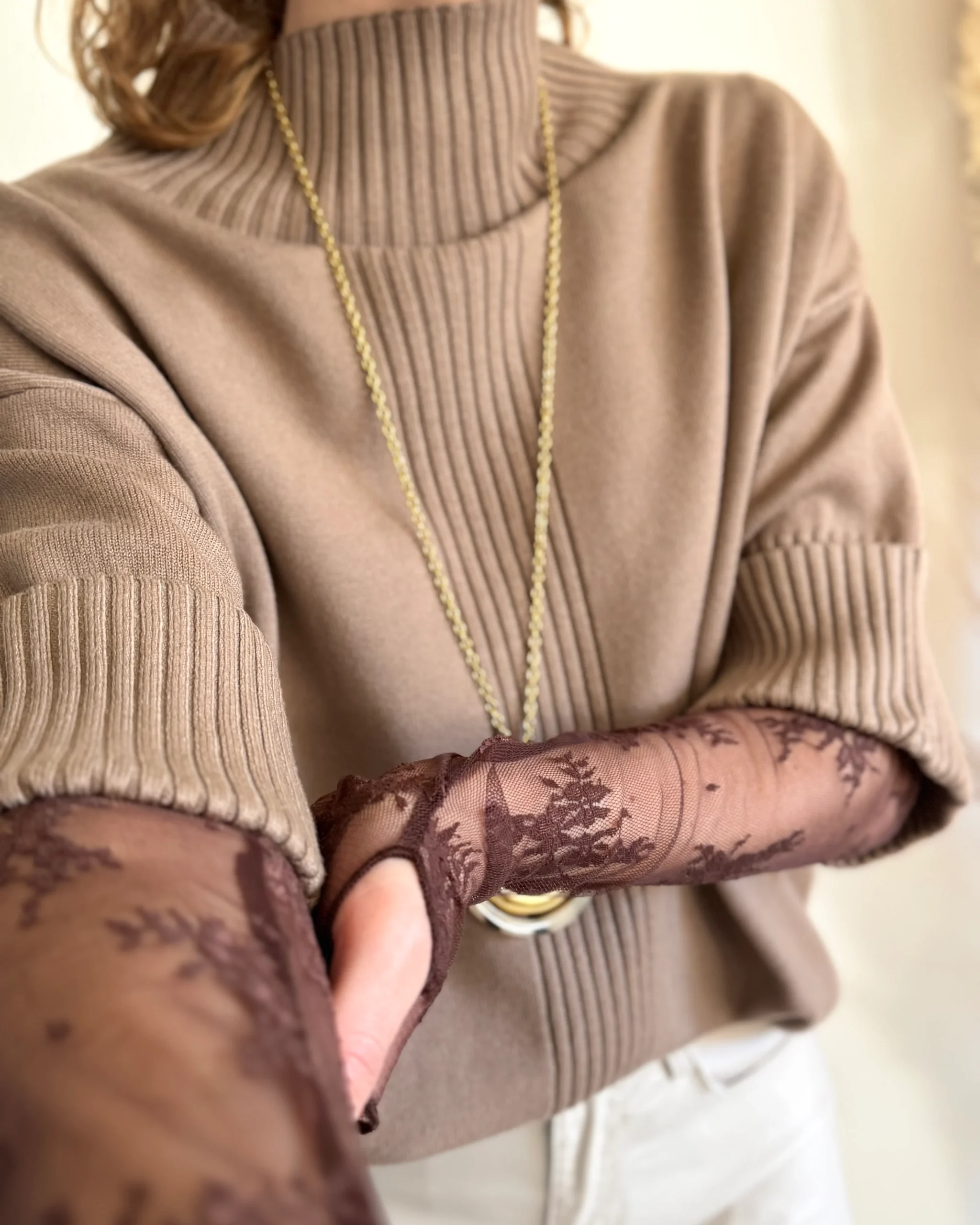 Ce top en dentelle chocolat à manches longues est un véritable bijou de délicatesse. Avec son col légèrement montant et sa découpe au niveau du pouce , il mêle romantisme et modernité. Sa coupe épouse joliment la silhouette et se glisse facilement sous une chemise ou un pull.