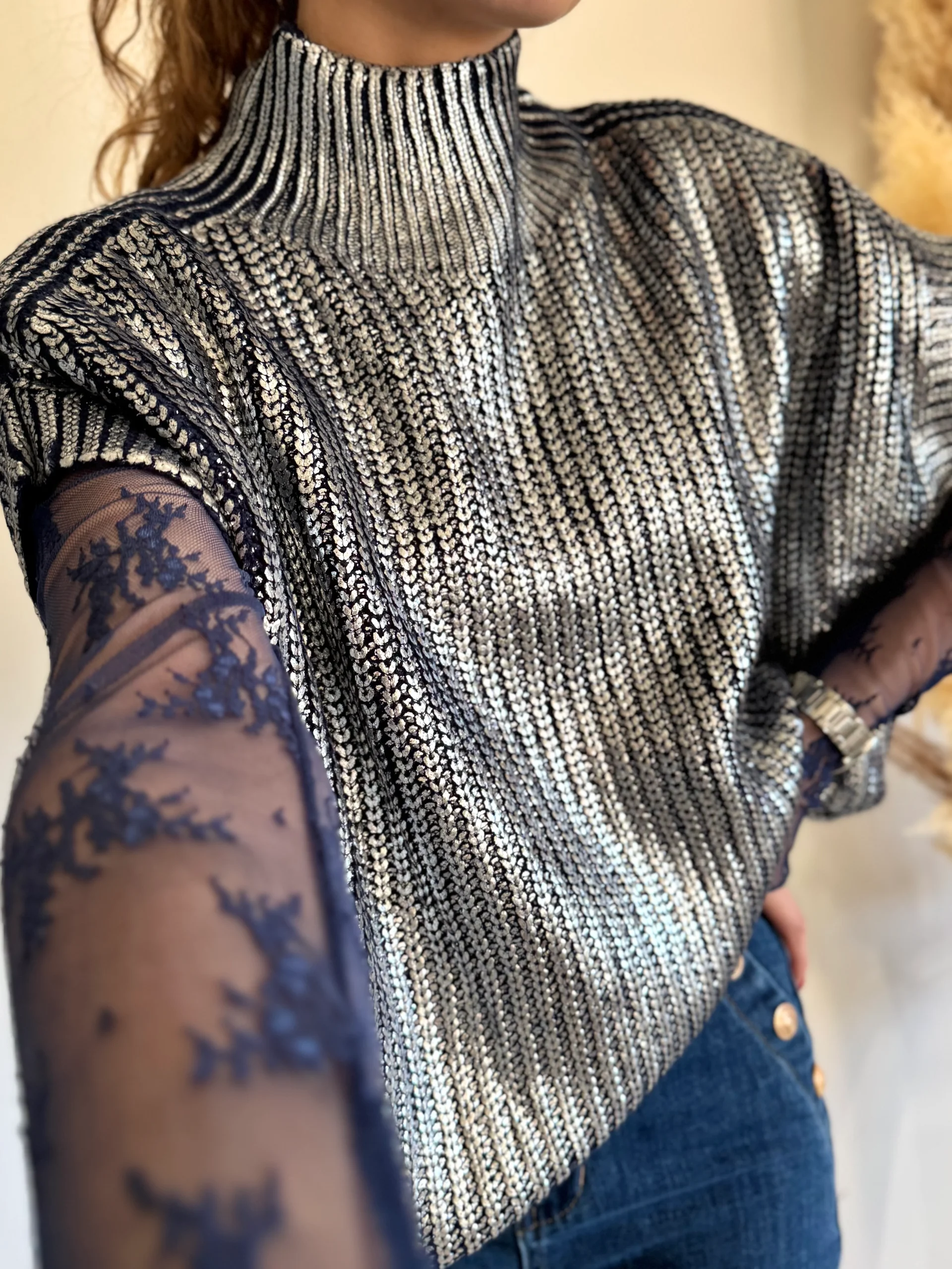 Ce top en dentelle bleu marine à manches longues est un véritable bijou de délicatesse. Avec son col légèrement montant et sa découpe au niveau du pouce, il mêle romantisme et modernité. Sa coupe ajustée épouse joliment la silhouette et se glisse facilement sous une chemise ou un pull.