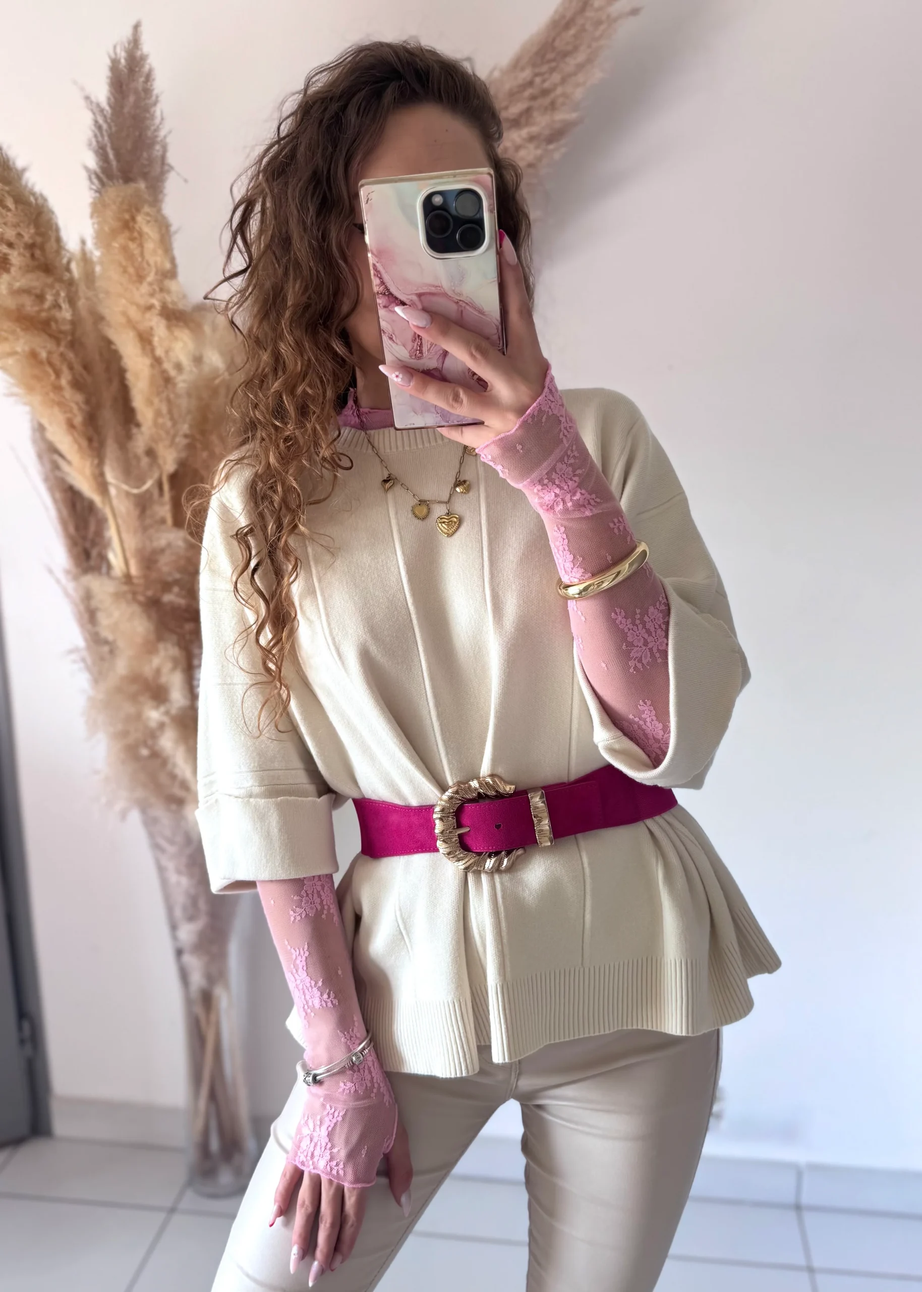 Ce top en dentelle rose est un concentré de féminité subtile. Avec ses manches longues , son col légèrement montant et sa découpe pour le pouce , il apporte une touche romantique et contemporaine à n’importe quelle tenue.