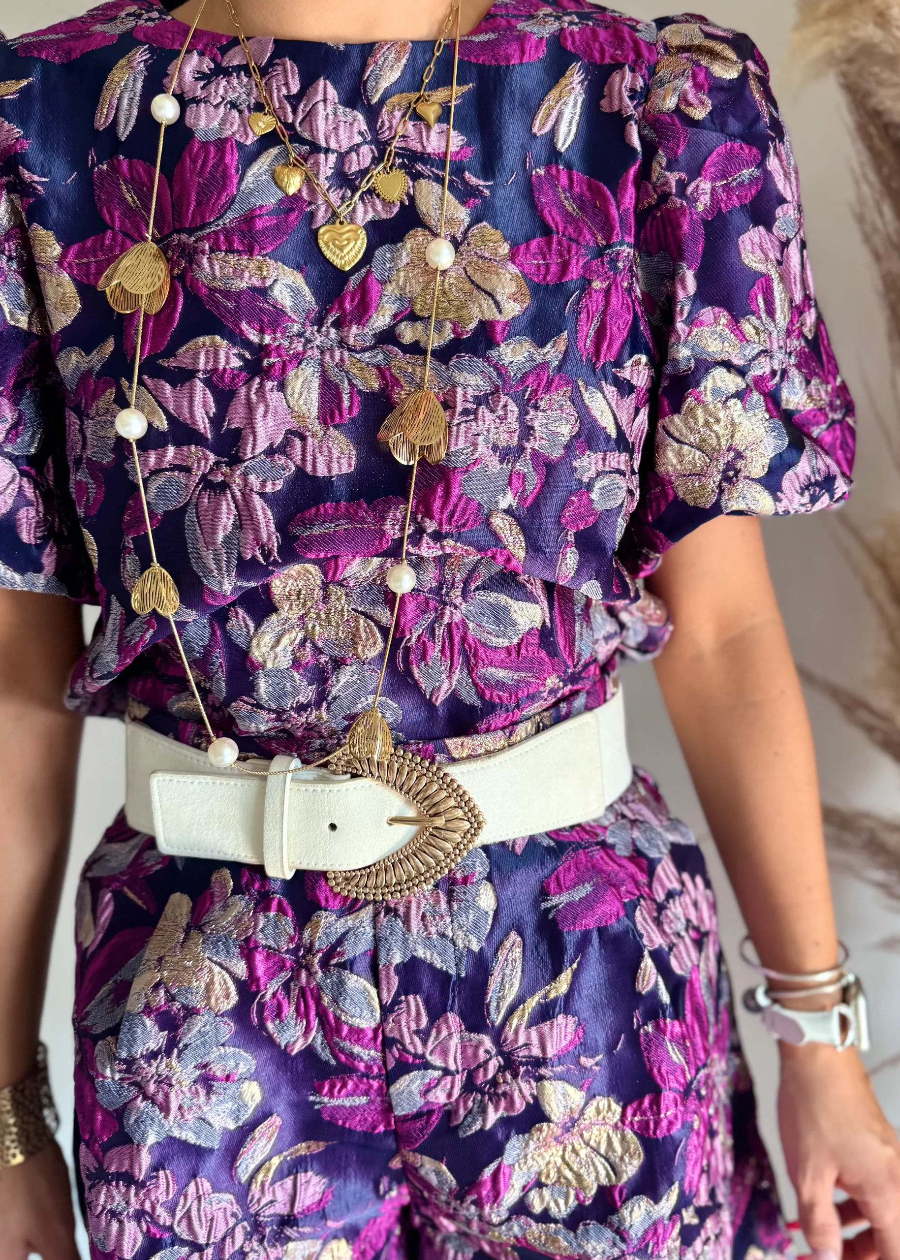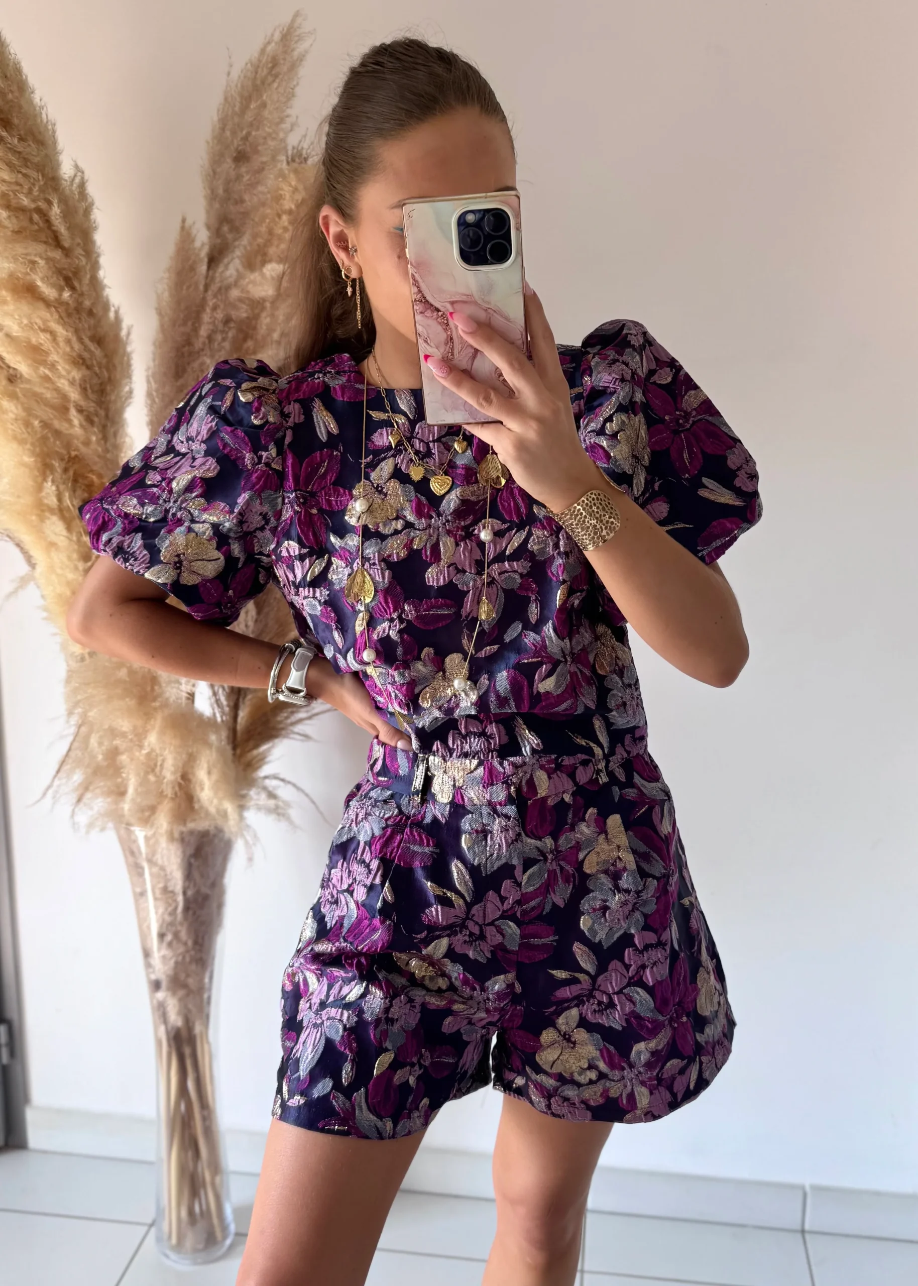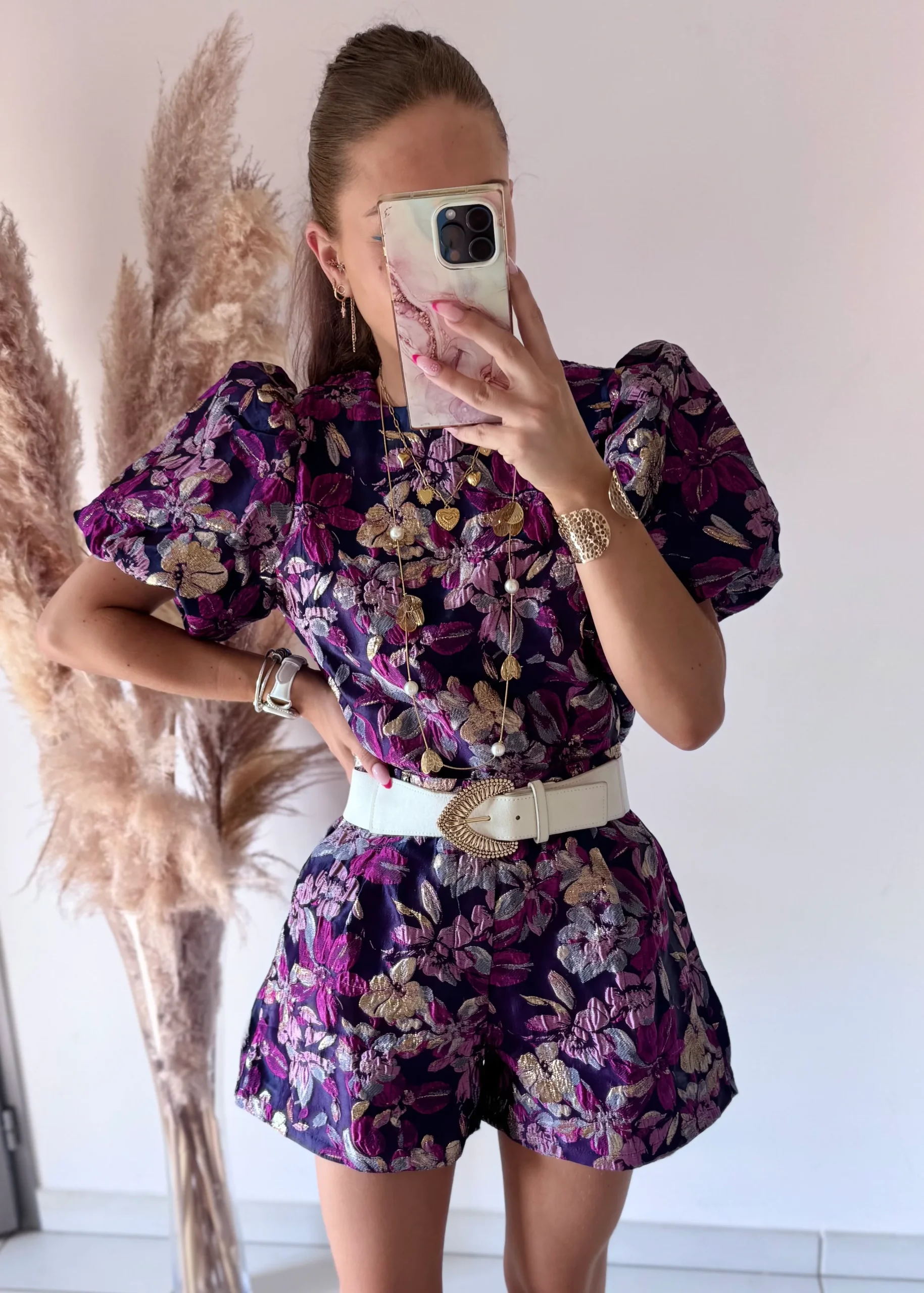 Un petit bijou de féminité ! Ce haut à manches courtes se distingue par ses motifs floraux mauve, rose et touches dorées qui illuminent la silhouette. Ses manches légèrement bouffantes apportent du volume avec légèreté. Parfait avec une jupe bouffante blanche ou à porter en total look avec le short GARDENIA !